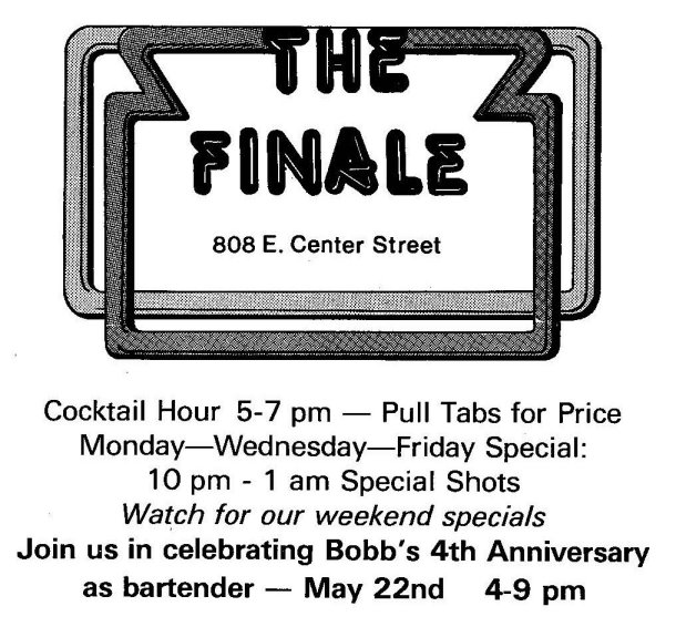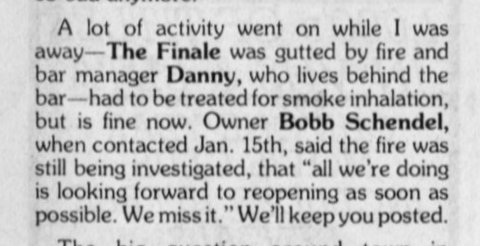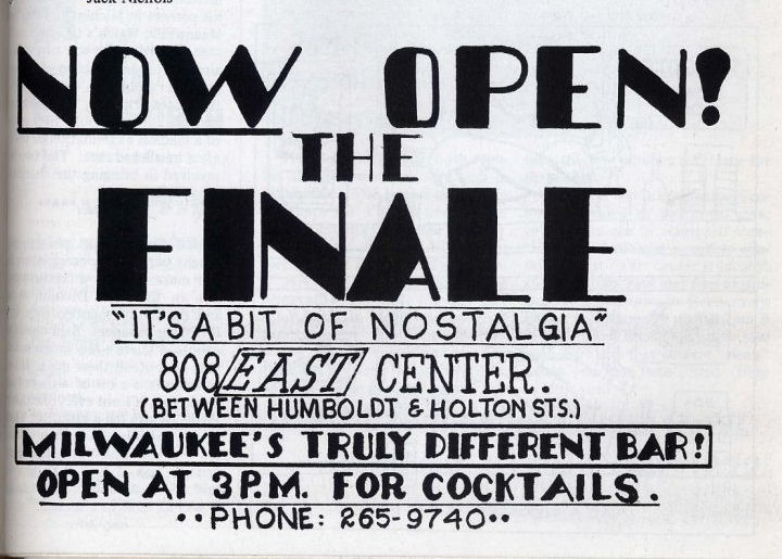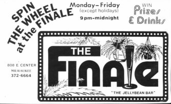 The Finale was opened by two male lovers, Earl and Frank Thalacker , and is remembered as a fun neighborhood bar that also drew a good crowd from throughout the city. The bar originally occupied just the front part of the building (entering the bar, the bar was on the right with tables against the wall on the left), but by January of 1976 had opened a second area a few steps higher in the rear half of the building, with dancing. The owners and bartenders knew their frequent customers well and had occasional after-bar parties for friends. The bar was known for fun costume and dress-up parties for special occasions (Halloween, New Years, etc.) among a clientele who would typically make it a single stop night, staying until closing (as opposed to patrons of the downtown bars who would frequently bar hop on such nights). The August 1976 issue of the local "GLIB Guide" describes the business as follows: "Elegant lounge, quiet chatter, neighborhood social, dancing." In 1980, co-owner Frank Thalacker moved on to open another LGBT business: the popular Shadows Bar where he added a Restaurant, which was widely praised for its food and atmosphere. In 1983, The Finale was sold to Bobb Schendel (who had been a bartender). The bar was closed after a fire gutted the place in January of 1986. Manager Danny, who lived behind the bar, was treated for smoke inhalation. Recollections: The following are recollections of others who have been kind enough to submit their personal memories to the webmaster. You are welcome to do the same! (Recollections collected and organized by Jamie Taylor.) ---> "Finale was a fun bar on holidays, and had the added advantage that it was the closest bar to where I lived (on the east side). But one New Year's Eve, even that wasn't close enough: that was the New Year's Eve of a huge blizzard in Milwaukee, and as we got into the wee hours, we realized we might be stranded there. Sure enough, we found our cars buried in snow, no snow plows in sight, and the roads impassable. No problem- after the bar finally locked the front doors, a small group of us stayed, and things took their natural course. As I recall, when we all woke up, finding any clothes that was our own was something of a challenge." ---> "I worked at the Finale after Bobby came in to C'est La Vie and offered me a job. I started on Sunday afternoons and quikly picked up cocktail hour every day. I heard so many stories about the place when Frank & Earl owned it. Stories of them locking the doors so they could all "have fun". David L. passed out under the pinball machine. There were plenty of days when the opening person had to lower the pool table light because the night before it was raised for… well… make up your own story… I pissed off many customers there on Sundays because I didn’t understand at the time that Sundays are for relaxing. (Most of the clientele was in their mid 30’s and older.) I am now that guy, bitching about how loud the music is. "The fire: Danny Morton and I had apartments above the bar. He had the larger rear apartment and I had the front apartment. One night Danny came banging on my door telling me there was a fire. We all got out including my dog Ruffles. Lots of smoke damage but livable. Not a week later I was coming home from partying downtown when I saw fire engines in front of the place yet again. I freaked out because Ruffles was in there. I was relieved when a firefighter (probably the same one from the fire before) brought me to his fire engine where Ruffles was safely inside. The fire gutted the bar and all my stuff (and Danny's) was ruined. That was the end of Finale. It was rumored that the owner torched the place because he was losing money (but that's only a rumor)." Finale Star newsletter, June 1984