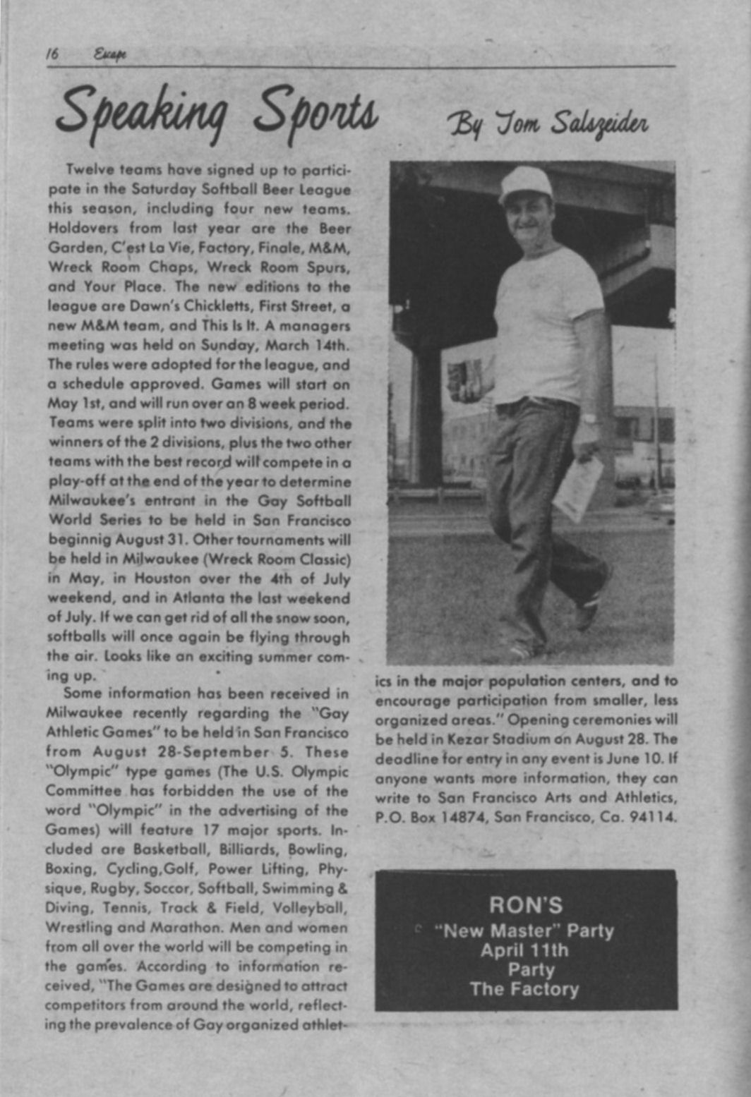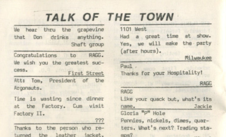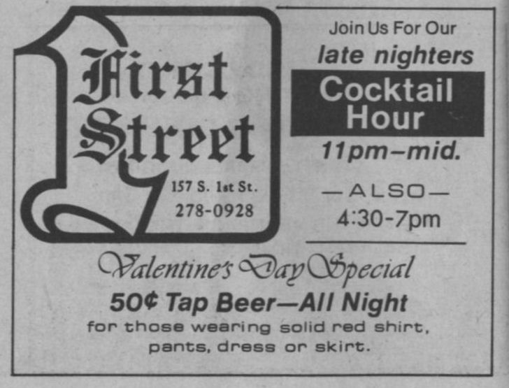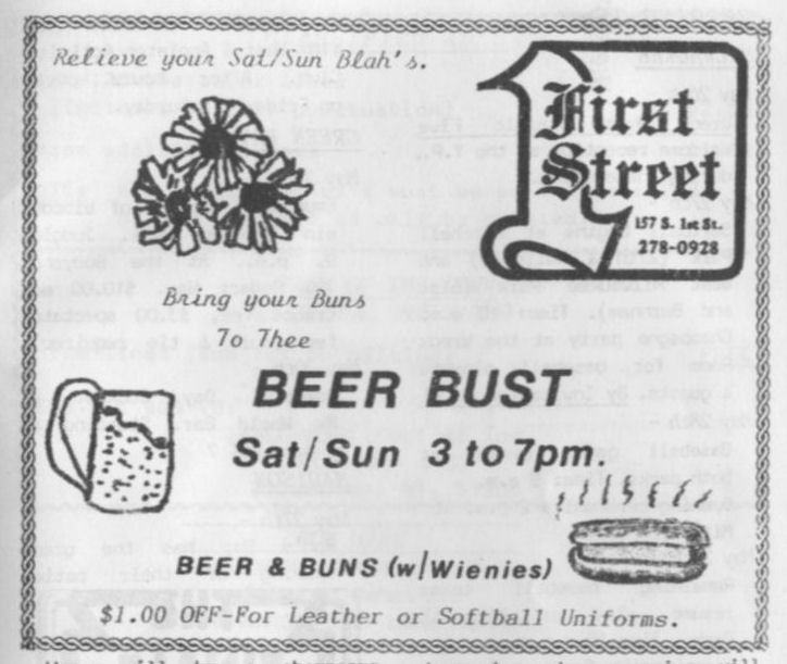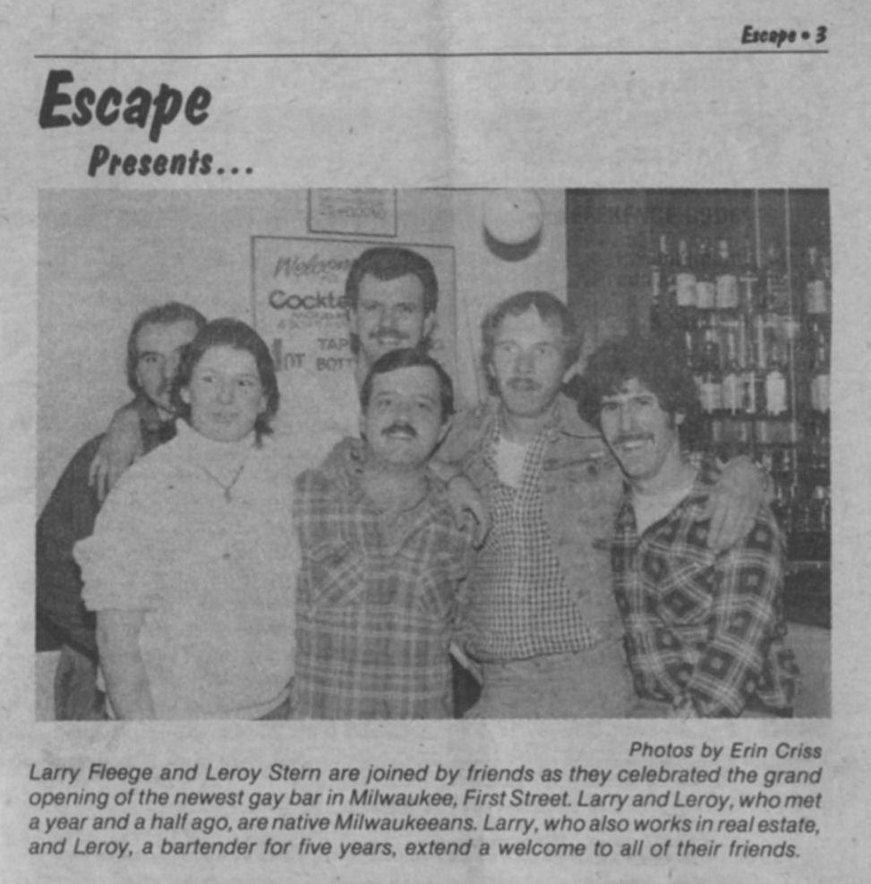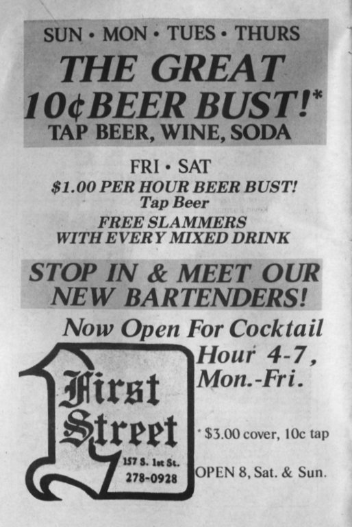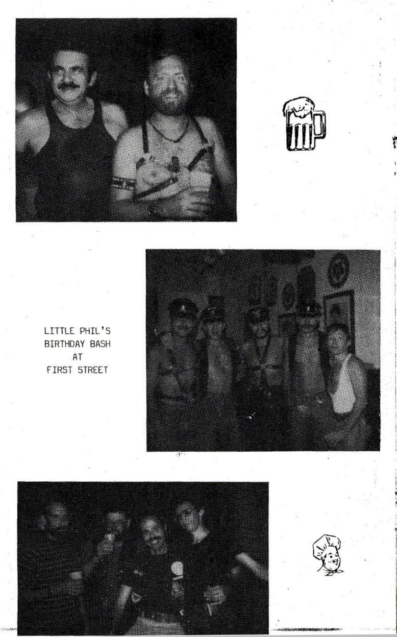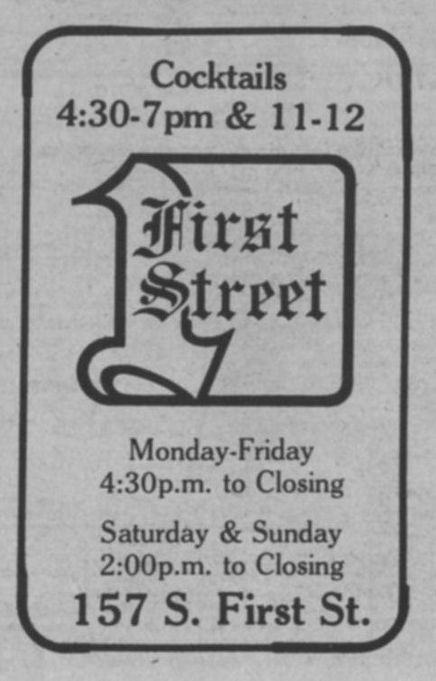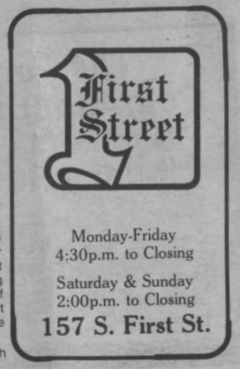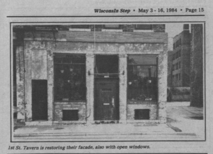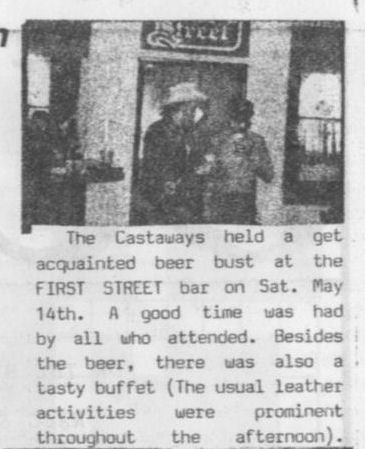 First Street Tavern was opened in December 1981 or January 1982. The first appearance of the bar in LGBT periodicals was in the January 1982 issue of Escape magazine: a cover photo of the owners, Larry Fleege and Leroy Stern, and inside the issue a photo of the Grand Opening party. We also have information from one Facebook contributor who once worked as a bartender there. 'First Street' largely catered to the levi/ leather crowd, for a time offering $1 off drinks for those in leather or softball uniforms. Bar patrons formed an SSBL softball team within two or three months of opening. They hosted at least one club night for the leather group Castaways with a beer bust and buffet, and at least one birthday party for a leather-scene patron. Facebook contributor C.P. recalls: "I worked as a bartender at First Street for about 6 months in 1982. I was just 18 at the time. There was a gay couple that owned the bar and lived in back. The bar had a wood stove that had to be tended to keep the bar warm and had music from a juke box." C.P. continues: "The bar had a small but loyal clientele, and also curiously attracted quite a few married "straight" couples. The wives would sit at the bar and have drinks while their husbands went off to find a trick, returning to pick them up at the end of the night. As I remember it, First Street was the first bar to uncover its windows, followed quickly by M&M Club who later claimed they were first." In one of the first issues of 'In Step' magazine (v1-07 May 1984), there is a photo of the front of the building and the caption "1st Street Tavern is restoring their facade, also with open windows" (in reference to a nearly simultaneous undertaking by the M&M Club). But In Step v1-12 in October 1984 includes the mention "First Street (has) been gone for a while...", so perhaps the bar closed before the renovation was complete-- apparently the building was more attractive to another tenant.