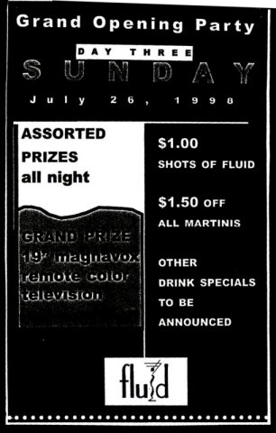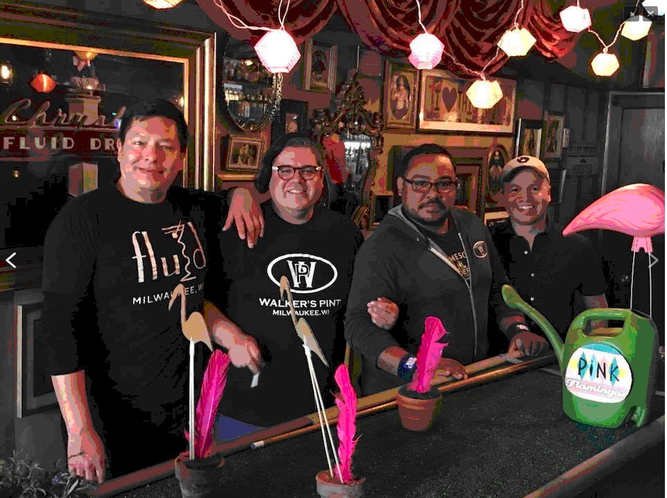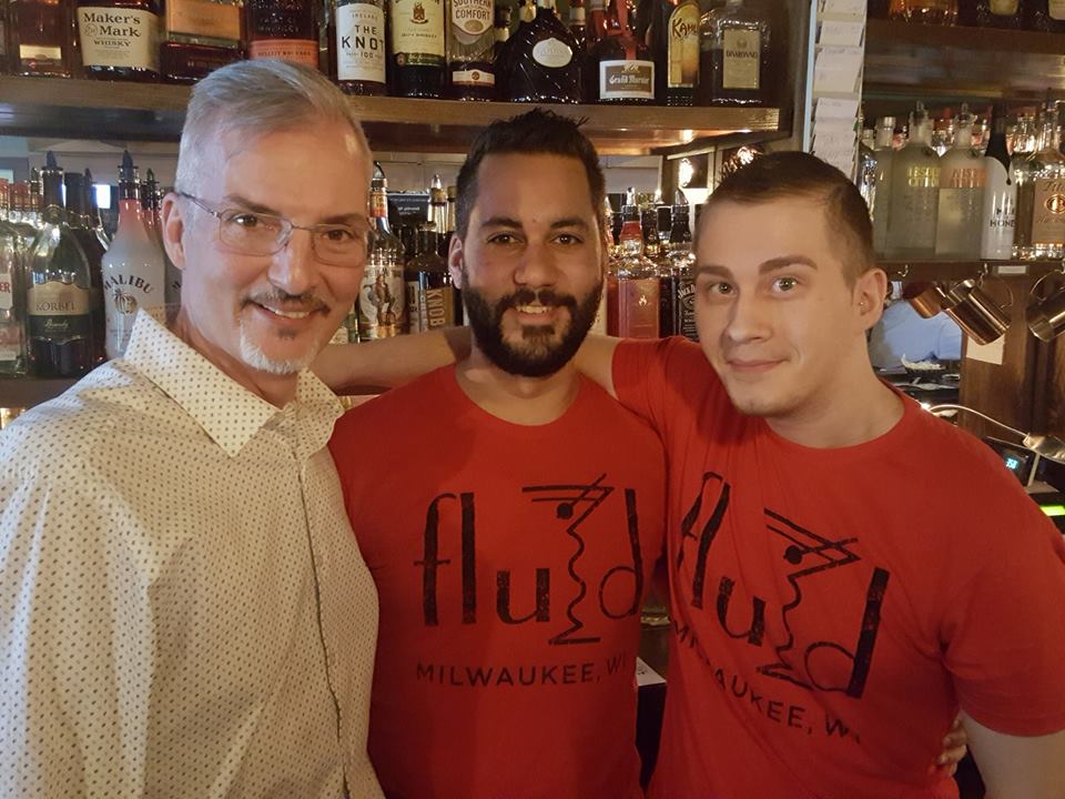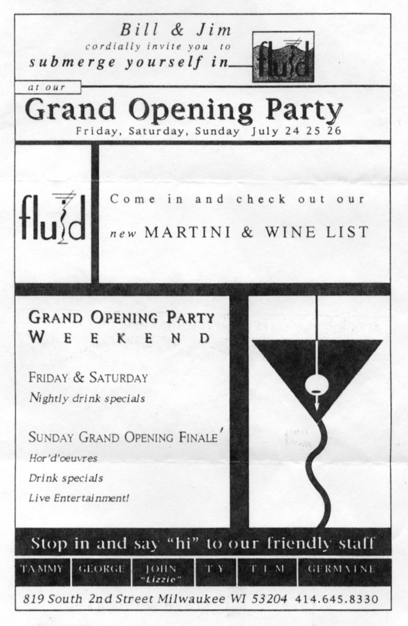 Fluid bar was opened two previous bartenders of the Triangle, Bill Wardlow and Jimmy. The bar was very popular from the day it was opened, pulling many customers from the Triangle bar. In addition to the popular bartenders bringing some of their loyal customers from the previous bar, another big draw for the bar's business was its proximity to the popular dance bar, La Cage, which was just half a block away. It became customary for many young men to first have a few cocktails at Fluid, then around 11:00 or 11:30pm to see an exoduc of people departing for La Cage to dance. Fluid's main distinguishing feature was its martini cocktails. It boasted a large offering of martini cocktails of all types, made in shakers and served in fancy martini glasses. This was at the beginning of the "martini craze", and was the first LGBT bar to offer such a wide selection of drink choices. After about 2 years, there was a falling out between the two owners. The bar closed for a short time, while Bill bought out Jimmy, and reopened it himself as sole owner and operator. The change was good for the business, and flourished even more. Over time, Fluid becamse known for several things. It was heavily involved in cooperating with other LGBT bars in the area in promoting events; for example, it helped work out a rotation of stops on such nights as Halloween, where the bars cooperated on a schedule of stops (one bar from 8-9:30, another 9:30-11, etc.) On anniversary and birthdays, the bar boasted a diverse and generous buffet. Many Sunday afternoons it had "Drag Queen Bingo" events. And many Christmas holiday parties saw numerous door prize give-aways, and regular customers recieved drink cards good for one free drink each month of the coming year. Meanwhile, as other bars seemed to struggle to accomodate smoking patrons as Wisconsin passed a "no smoking" law for bars and restaurants, Fluid constructed an outdoor patio area called "The Terrace" where customers could relax with cigarettes or just for some fresh air. (Opened October 4, 2014: Quest v21-10 pg 17.) This area was quickly enclosed by a tent and equipped with fire pit and heaters to allow its use even in the cold winter months. Thus even after the 2020 COVID pandemic (which forced the temporary closure of bars and restaurants for months, and when many went out of business), Fluid continues to be a popular destination for many men, and has a changing array of handsome young men serving as bartenders- always good eye candy for the customers. This location has been host to a long tradition of LGBT establishments. The first was apparently "Friendly Bar" (1944-1947). It was operating as 'The Hustler' in the early 1970s, which may also have been somewhat gay friendly (additional research is needed). Its run as indisputable LGBT establishments really began when it became 'The Decision' in 1976. Next it was Hideaway (1976-c1980), after which its occupancy was uncertain for a few years. But its string of housing LGBT businesses resumed with the relocated Mint Bar II/ Angelo's (1986-1991), followed by BJ's Mint Bar (1991-1993), Zippers (1993-1998), and finally Fluid in 1998-- which is still open in 2021. |