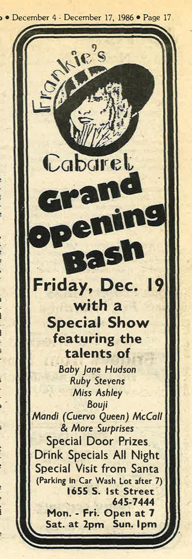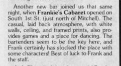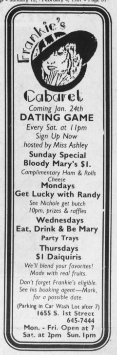 Frankie's Cabaret opened with great fanfare, and advertised heavily. However, it lasted less than a year, closing its doors for the last time on May 30, 1987.