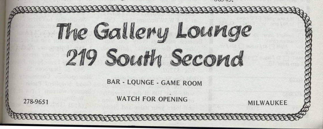 The Gallery Lounge was advertised as "Bar, Lounge, Game Room" in the September, 1974 issue of GPU News, and added "Watch for Opening". The December issue showed photos of the interior of the bar. But there is no record of when the bar closed. In late 1975 this location would re-open as Mister Z's, then briefly in mid-1976 as Gary's, which soon morphed into Club Circus, then Circus-Circus, and eventually Club 219, a succession of disco and dance clubs. More information about this business is welcomed from anyone who can contribute it.