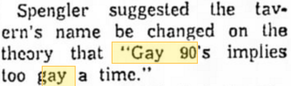 Research by Michail Takach found the "Gay 90's" bars was in three locations over its life, with registered owners as shown: