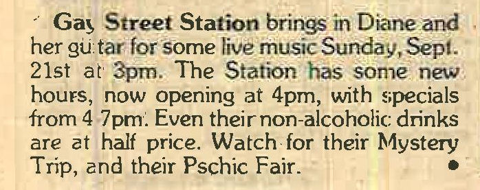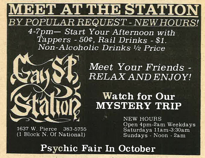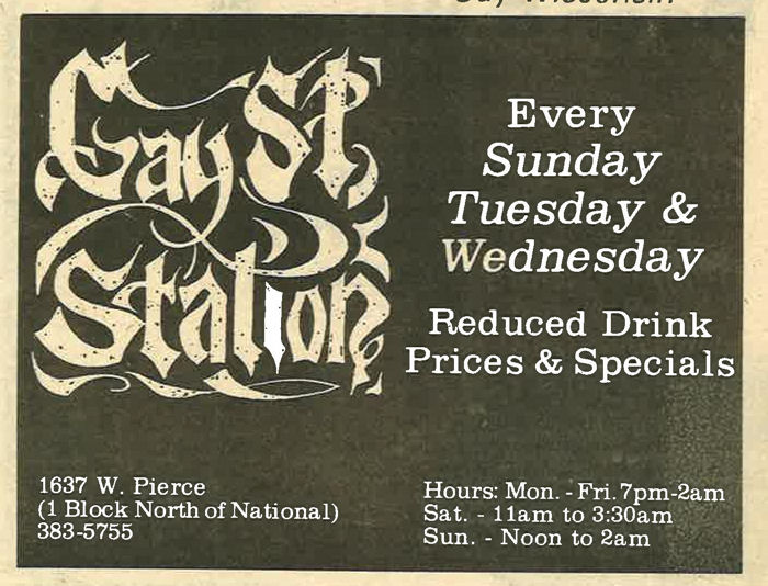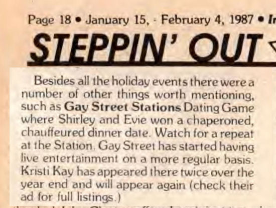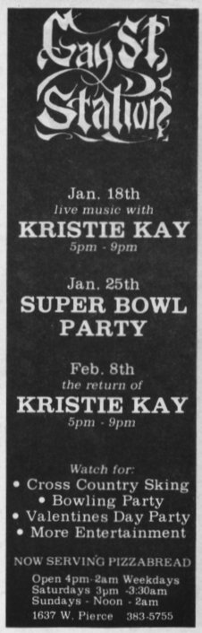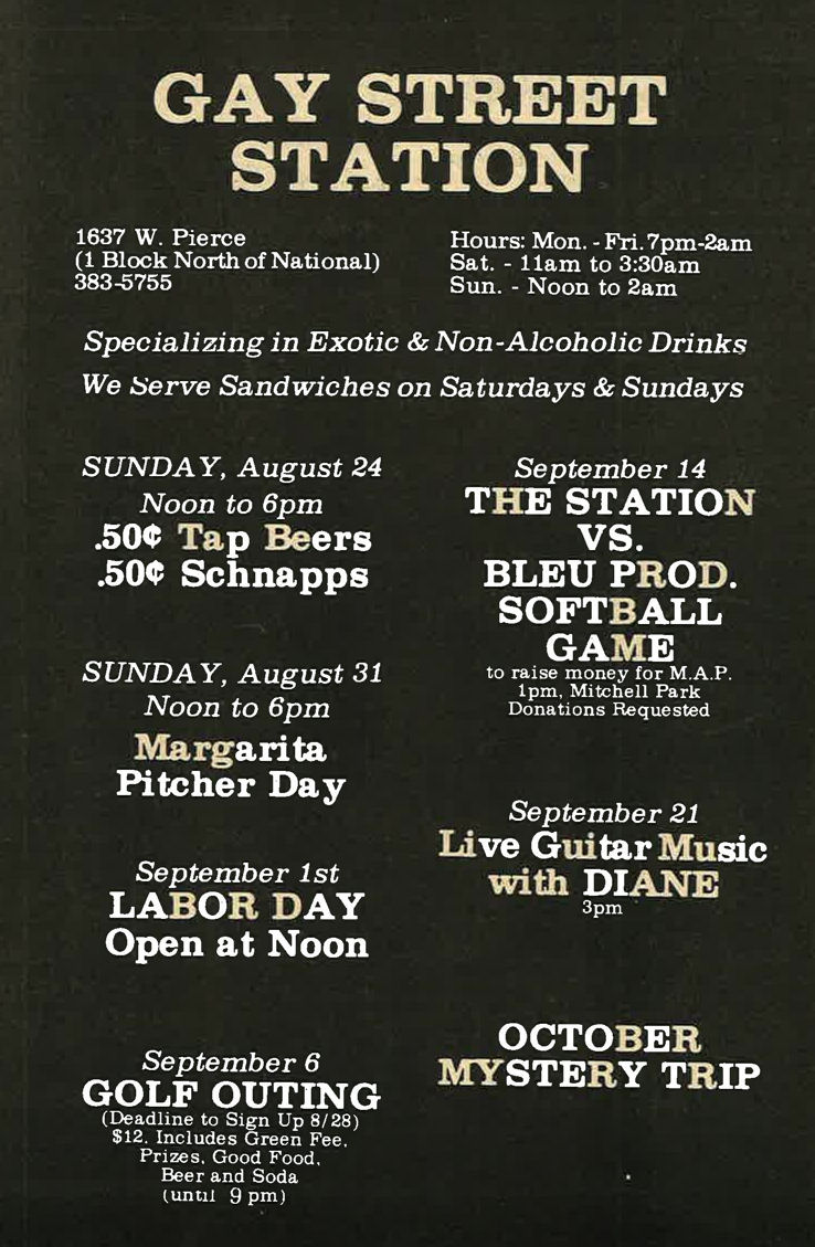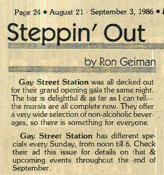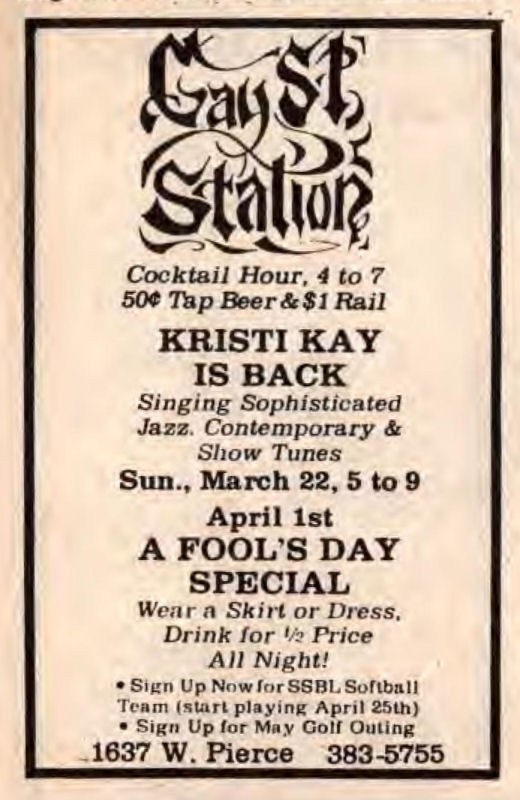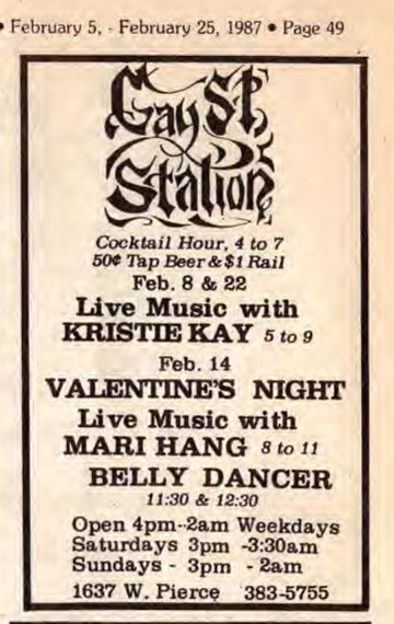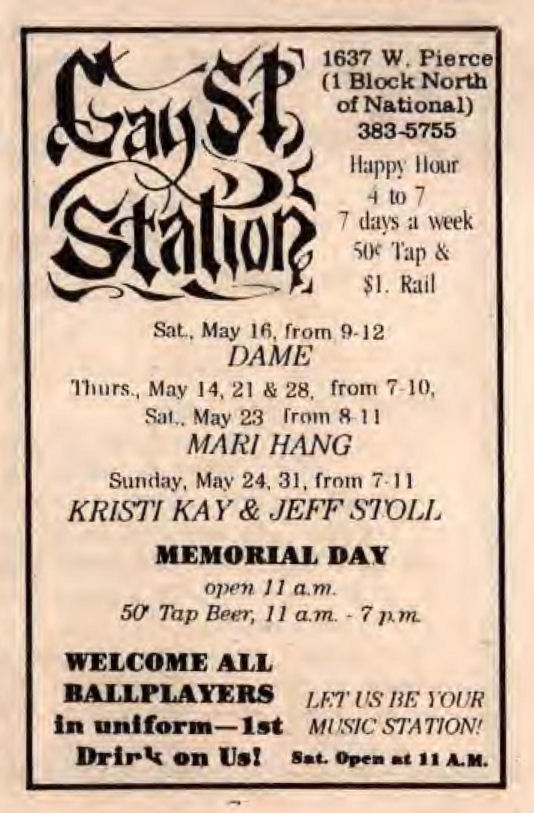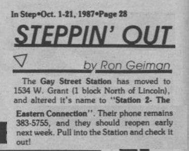Gay Street Station had their Grand Opening on August 1, 1986, although the bar had a quiet 'soft' opening sometime in July 1986. The bar is described in its first mention in In Step magazine's 'Steppin' Out' column as: "a new bar with an emphasis on women. Located at 1637 W. Pierce, (1 block north of National), it has a turn of the century/ Union Station bar decor. Billed as a beer saloon, they offer an extensive list of non-alcoholic beverages. Their grand opening is scheduled for August 1st, but they are already open...". Early ads and articles included mentions that "the murals are all complete now", and that the bar served sandwiches on Saturdays and Sundays. The mention of murals is interesting, but the only interior photo we are aware of is in the first advertisement (to right) (plus a photo of two contest winners presumably in a corner of the bar, in late 1986). This was the first bar operated by owners Lois & Sheri, but it was very short-lived. They relocated the business and renamed it Station II- The Eastern Connection, late in October 1987, which proved to be a much better venue: that bar operated for about 14 years. More information about the original Gay Street Station is welcomed from anyone who can contribute it. |