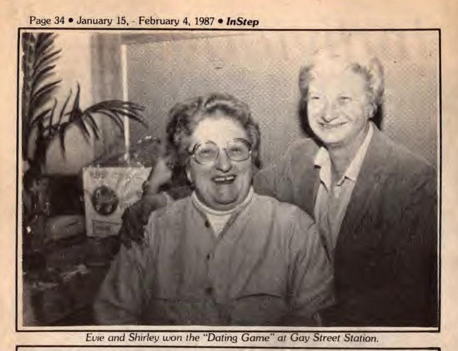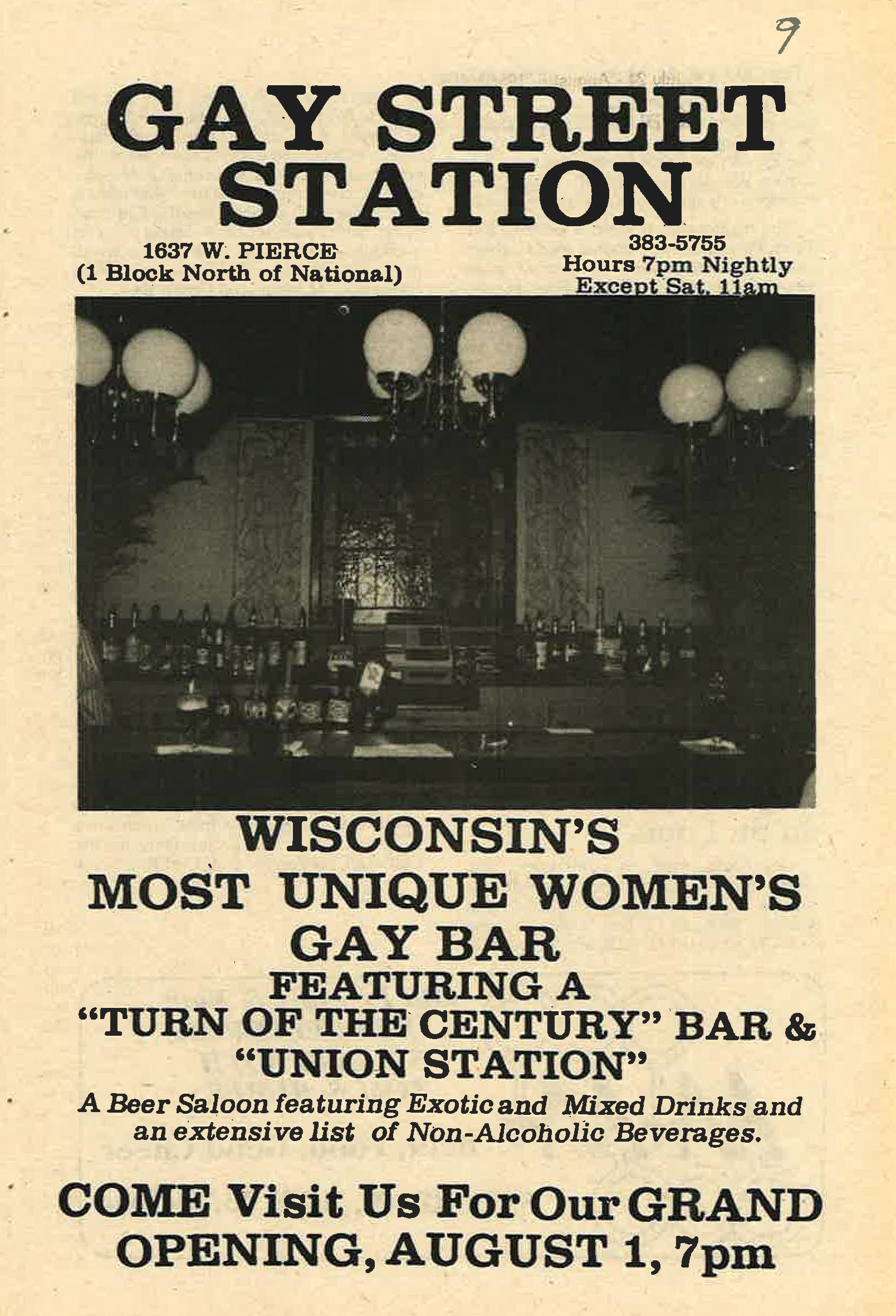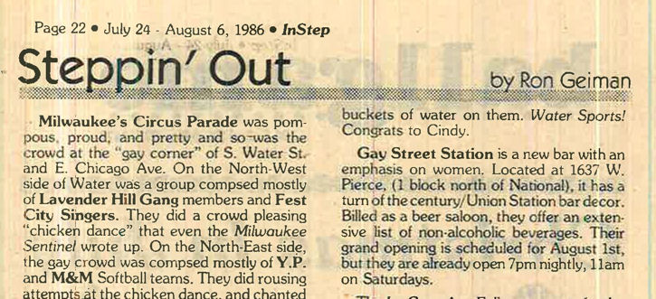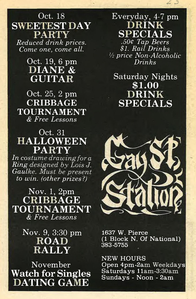 Gay Street Station had their Grand Opening on August 1, 1986, although the bar had a quiet 'soft' opening sometime in July 1986. The bar is described in its first mention in In Step magazine's 'Steppin' Out' column as: "a new bar with an emphasis on women. Located at 1637 W. Pierce, (1 block north of National), it has a turn of the century/ Union Station bar decor. Billed as a beer saloon, they offer an extensive list of non-alcoholic beverages. Their grand opening is scheduled for August 1st, but they are already open...". Early ads and articles included mentions that "the murals are all complete now", and that the bar served sandwiches on Saturdays and Sundays. The mention of murals is interesting, but the only interior photo we are aware of is in the first advertisement (to right) (plus a photo of two contest winners presumably in a corner of the bar, in late 1986). This was the first bar operated by owners Lois & Sheri, but it was very short-lived. They relocated the business and renamed it Station II- The Eastern Connection, late in October 1987, which proved to be a much better venue: that bar operated for about 14 years. More information about the original Gay Street Station is welcomed from anyone who can contribute it. |