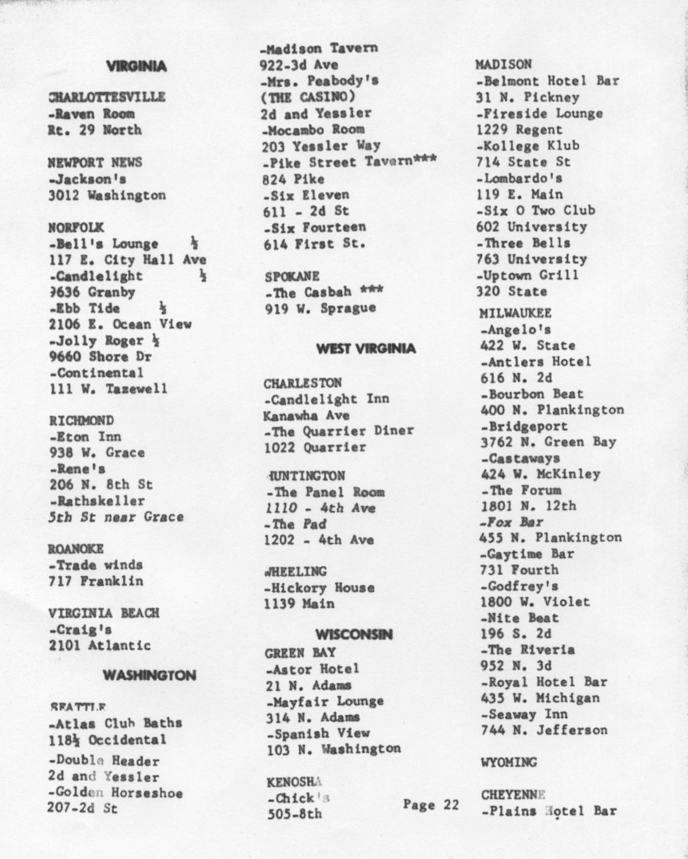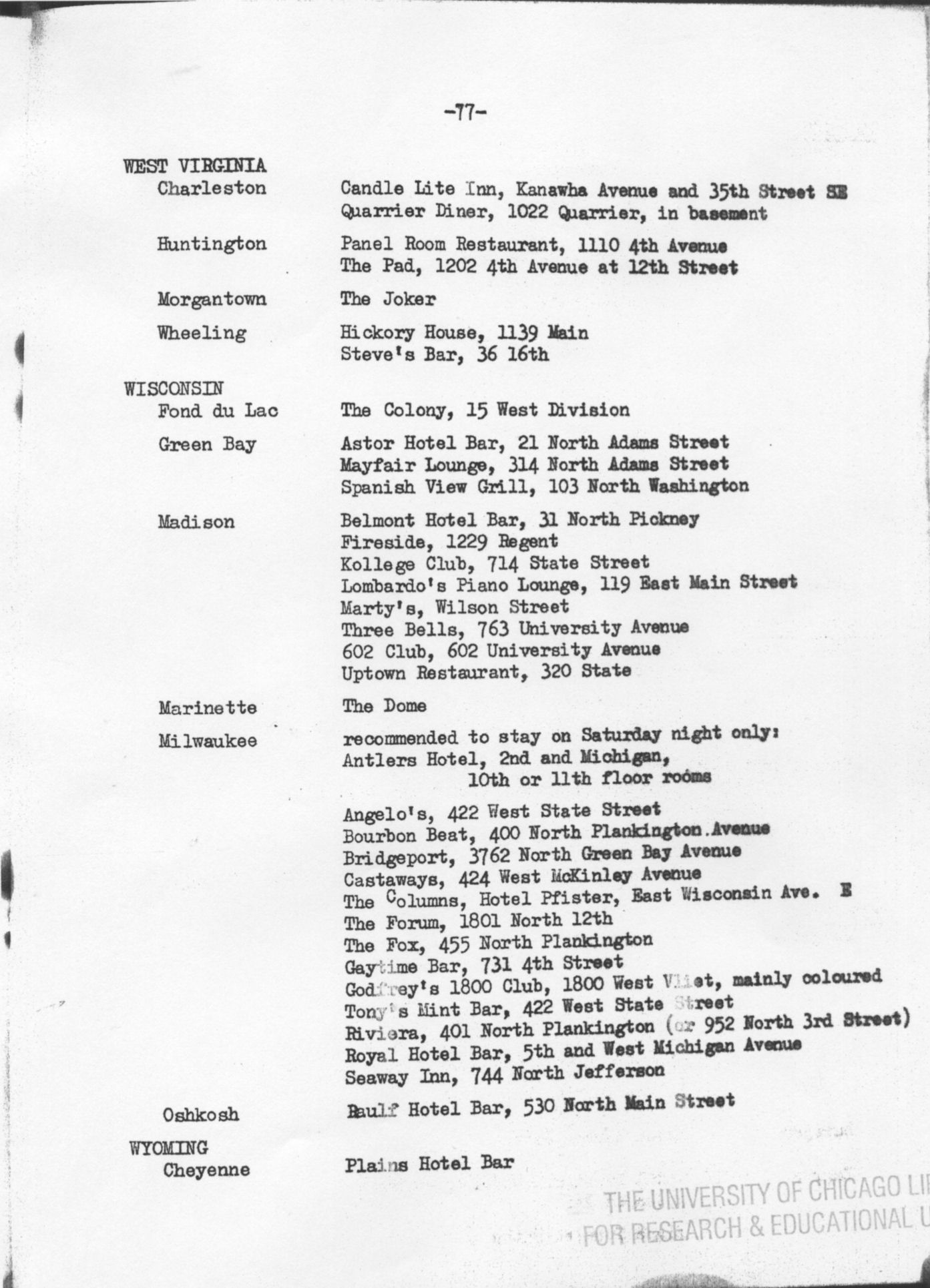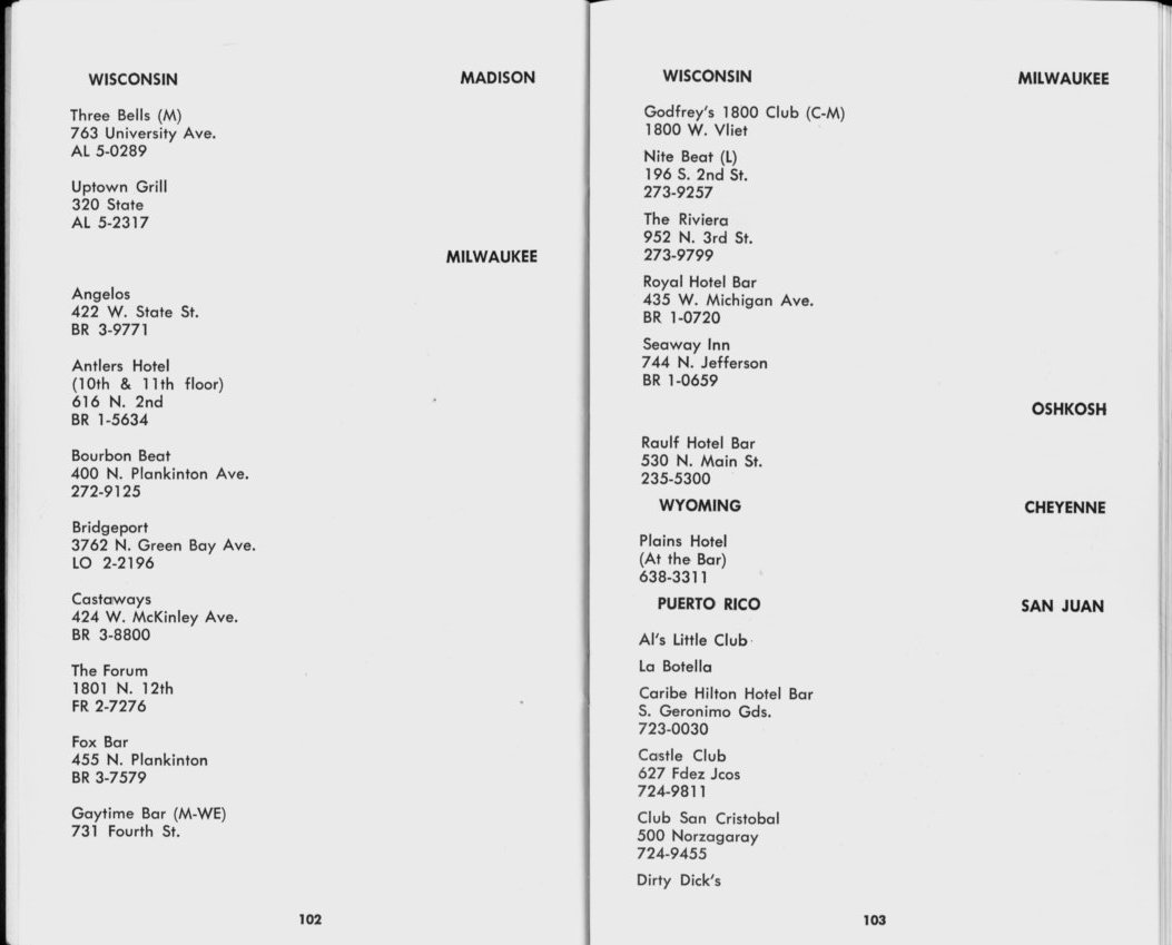 Godfrey's 1800 Club is listed in select national Gay Bar Guides from 1965 to 1969, as a "mostly coloured" (aka black/ African American), mixed bar. (The bar is conspicuously missing from any Bob Damron guides during the period however. Did Bob Damron Guides exclude 'coloured' bars, or did its Milwaukee sources not report it?) No local documentation is known. More information about this business is welcomed from anyone who can contribute it.