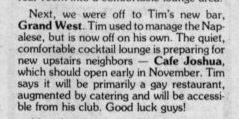 Grand West was a "quiet, comfortable cocktail lounge" in Green Bay. It first appeared in the Bar Guide of 'In Step' magazine vol. 3-12 (June 1986). Sources indicate it was owned by Michael DeGrand and Tim Westland. Tim had previously been a manager of the Napalese Lounge, and went off on his own to open Grand West with Michael. There were also plans to open "Cafe Joshua" upstairs in the same building in Nov. 1986 (by a different owner), described as "primarily a gay restaurant, augmented by catering" and accessible from the club. While there are infrequent mentions of the bar for the next few years, the bar disappears from the Bar listings of 'In Step' magazine after the vol. 7-02 (February 1990) issue, and is not mentioned again. More information about this business is welcome from anyone who can contribute same. |