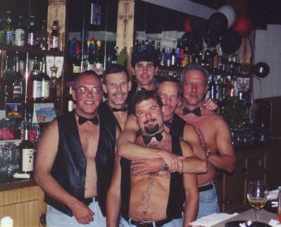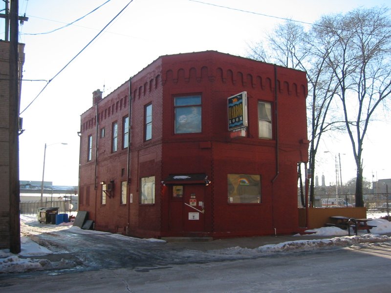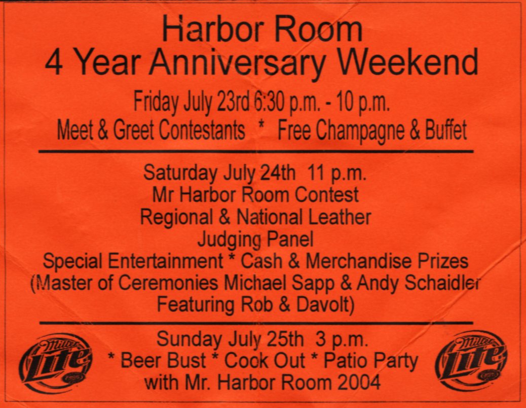 Harbor Room was opened by Gregg Fitzpatrick as a bar tucked just off South 1st Street, about 6 blocks south of the major bar area- and its main competition, the Boot Camp. The Boot Camp had been the city's sole levi/ leather bar for some years, and was becoming crowded and a bit "tired" for some people. Parking around the Boot Camp was also becoming more difficult. The time for another Milwaukee leather bar just seemed right. Harbor Room is housed in an historical building, mid-block. Almost kitty-corner to the Allen Bradly complex, and at the time largely surrounded by Grede Foundry, the bar was popular almost immediately, and in short order was filled to capacity late on Friday and Saturday nights. The owner (Gregg Fitzpatrick) and his partner (Eddie) moved in above the bar, and they and their dog were seen regularly. Soon after opening, a patio was opened outside, about 50% larger in size to the inside area of the bar- used for cookouts and general customer appreciation of the weather. A raised section was built as well, and used for shows (especially the annual Mr. Harbor Room contest). Harbor Room has been innovative in several areas. For one thing, they open early in the morning: initially at 8:00am, and later opening at 7:00am each day. Surprisingly to some, they have seen good business with their early hours, as the only gay bar open when 3rd shift employees get off work. The patio also has extended use: while some bars close their patios during the winter, the Harbor Room patio is open whenever the bar is (a porta-toilet added to the back of the building, coupled with the always-open patio, legally doubles their occupancy limit). They have regular drink and bar specials- most notably early on "half price drinks for men without shirts- all the time" (although that promotion was cancelled around 2015). They served free pizza during happy hours daily. An election was also held each anniversary for the Mr. Harbor Room title-holder (see the Images page for the list of title-holders and photos.) As with most bar and restaurant businesses, the COVID-19 pandemic starting in early 2020 and continuing into early 2021 caused severe disruption of the business. The bar was closed for some time, and as of January 2021 continued to operate at reduced capacity and with strict social distancing rules, and the elimination of such things as shared food/ pizza etc. But the bar continues to operate and was coming back to normal as vaccines became available. Unfortunately, 2021 saw two tragedies: first co-owner and Gregg's married partner, Eddie Carver, passed away in June 2021. Then on December 12, 2021, owner Gregg Fitzpatrick also passed away. (We are told that Gregg left the bar, in equal parts, to Brian Kohler and Robert Murphy, who plan on keeping it running. ) Recollections: The following are recollections of others who have been kind enough to submit their personal memories to the webmaster. You are welcome to do the same! (Recollections collected and organized by Jamie Taylor.) --------