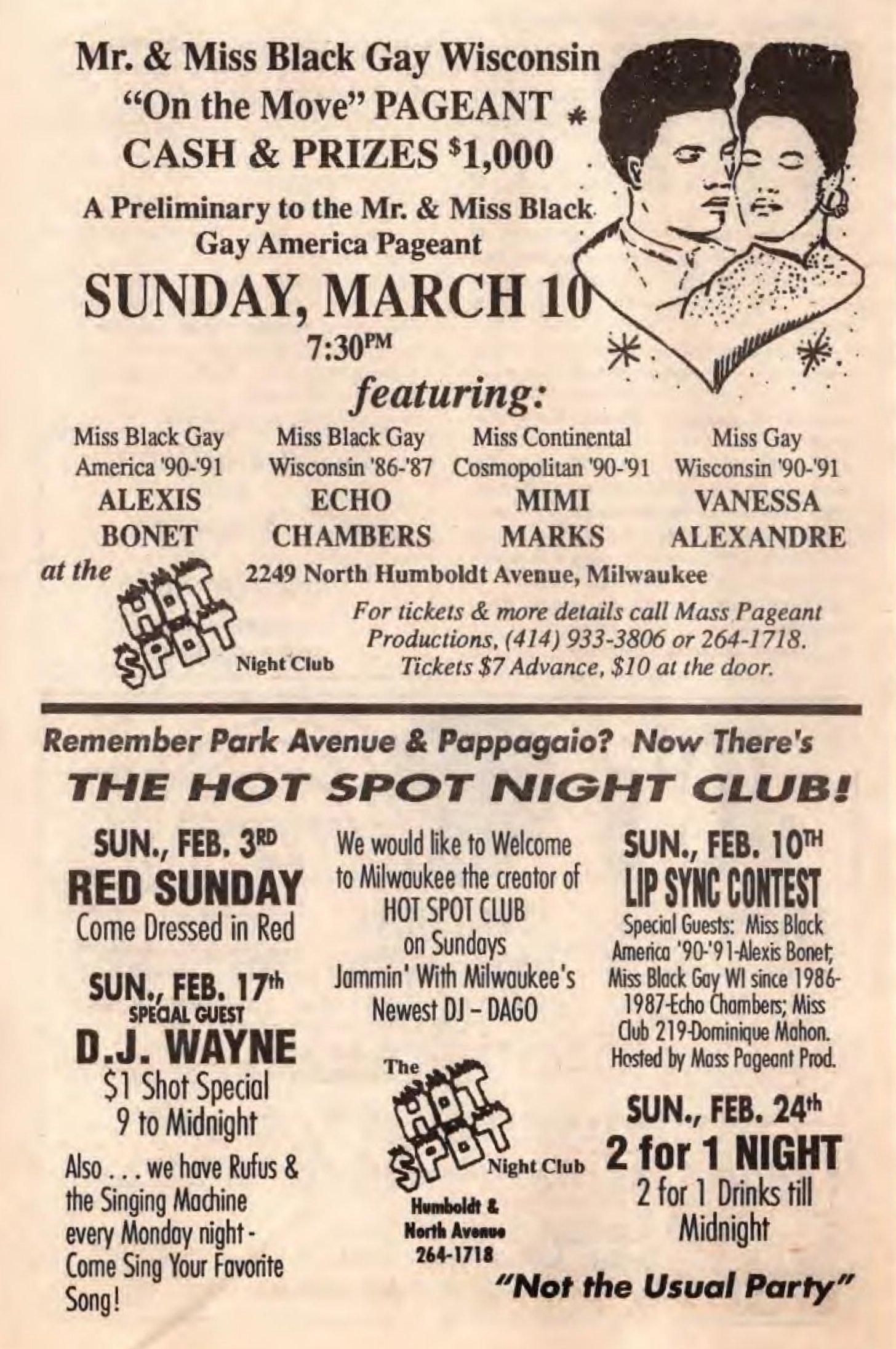 The Hot Spot Night Club existed briefly in 1991. They tried to take the place of the formerly popular 'Park Avenue' and 'Papagaio' dance (disco) clubs, but never really made it. They did host the Mr. & Miss Black Gay Wisconsin pageant in March 1991, and so also presumably catered to the 'black' audience as well. We will be researching the dates this bar was listed in the media bar Guides to try to narrow the timeline. Any additional information is available from anyone willing to contribute it.