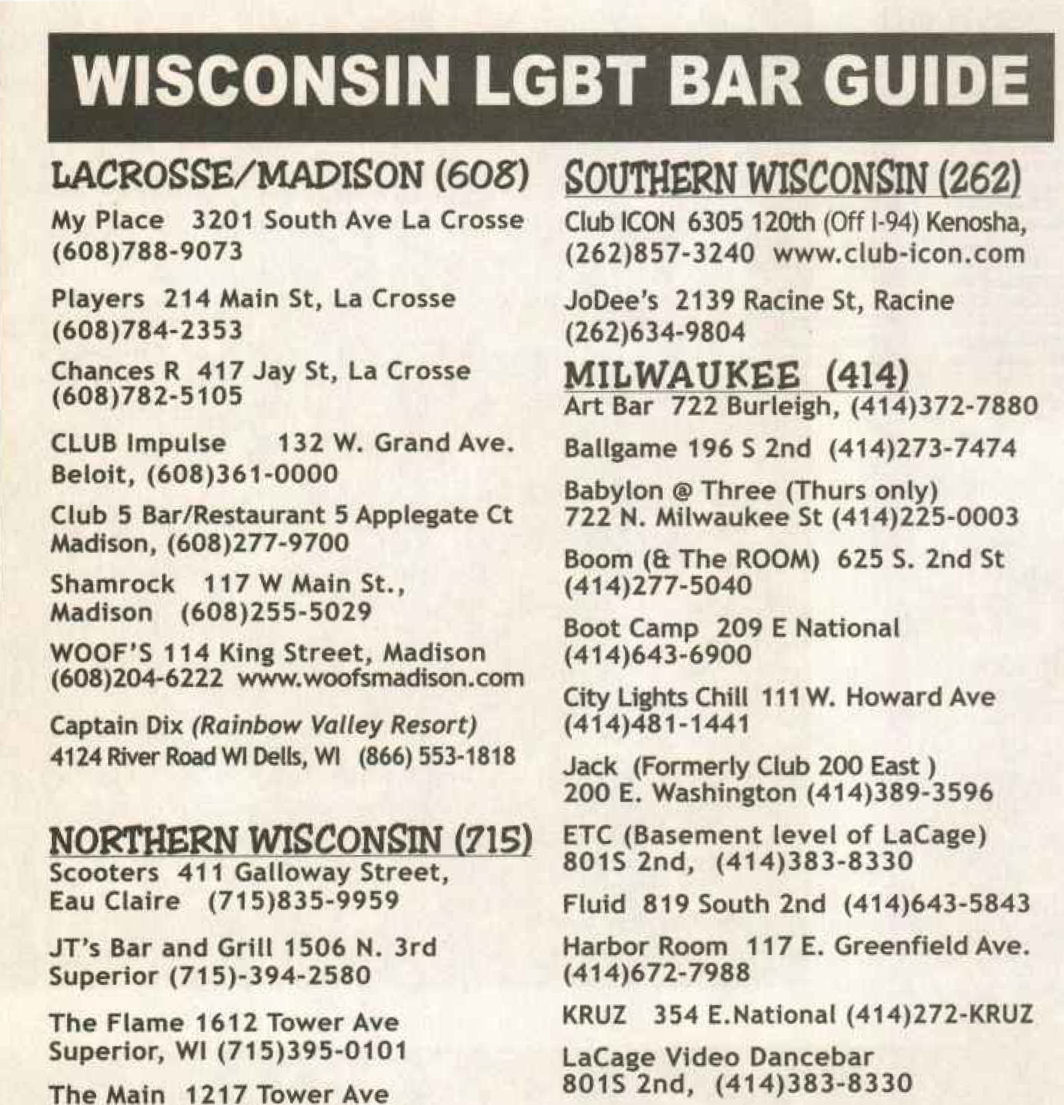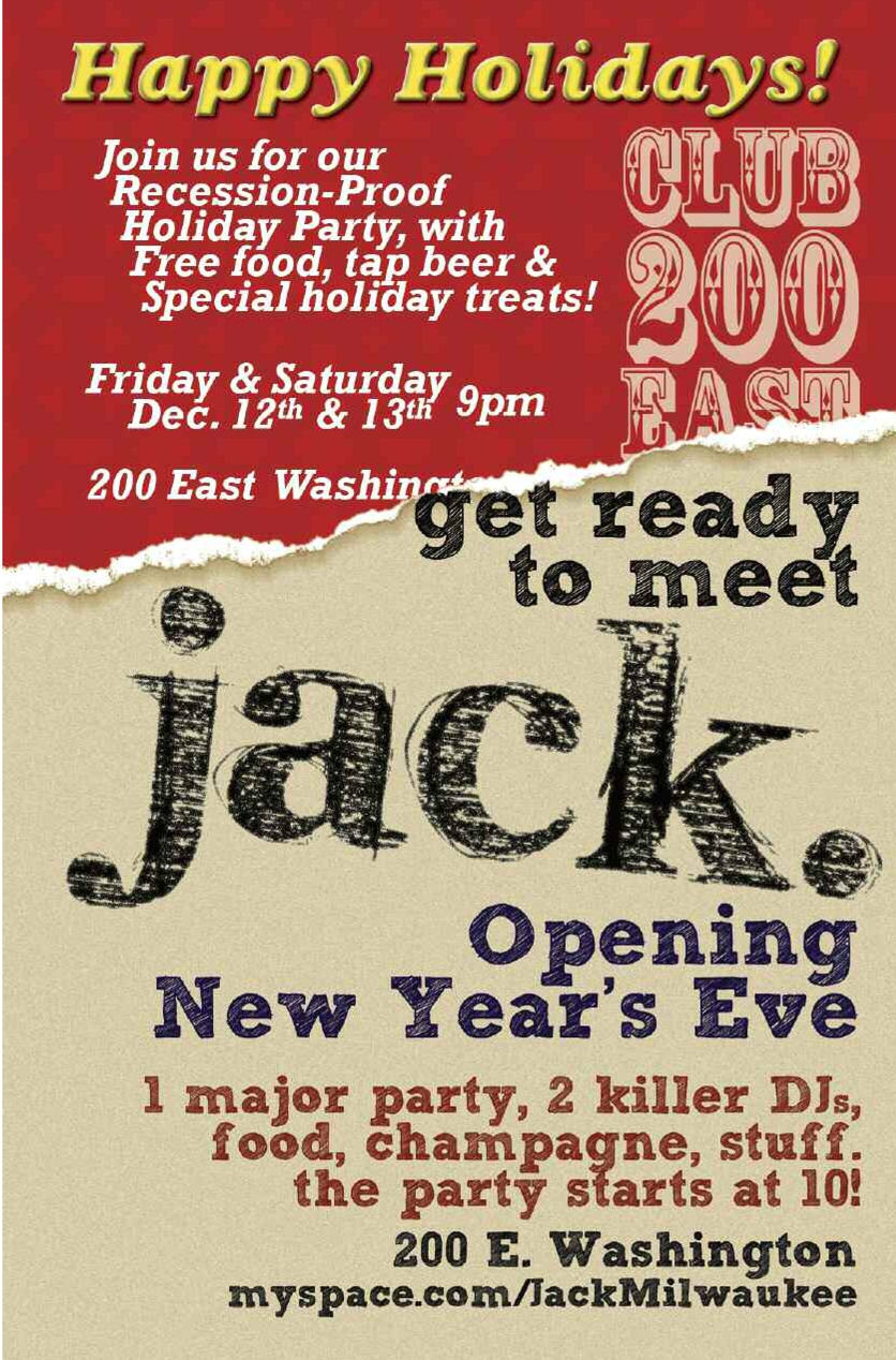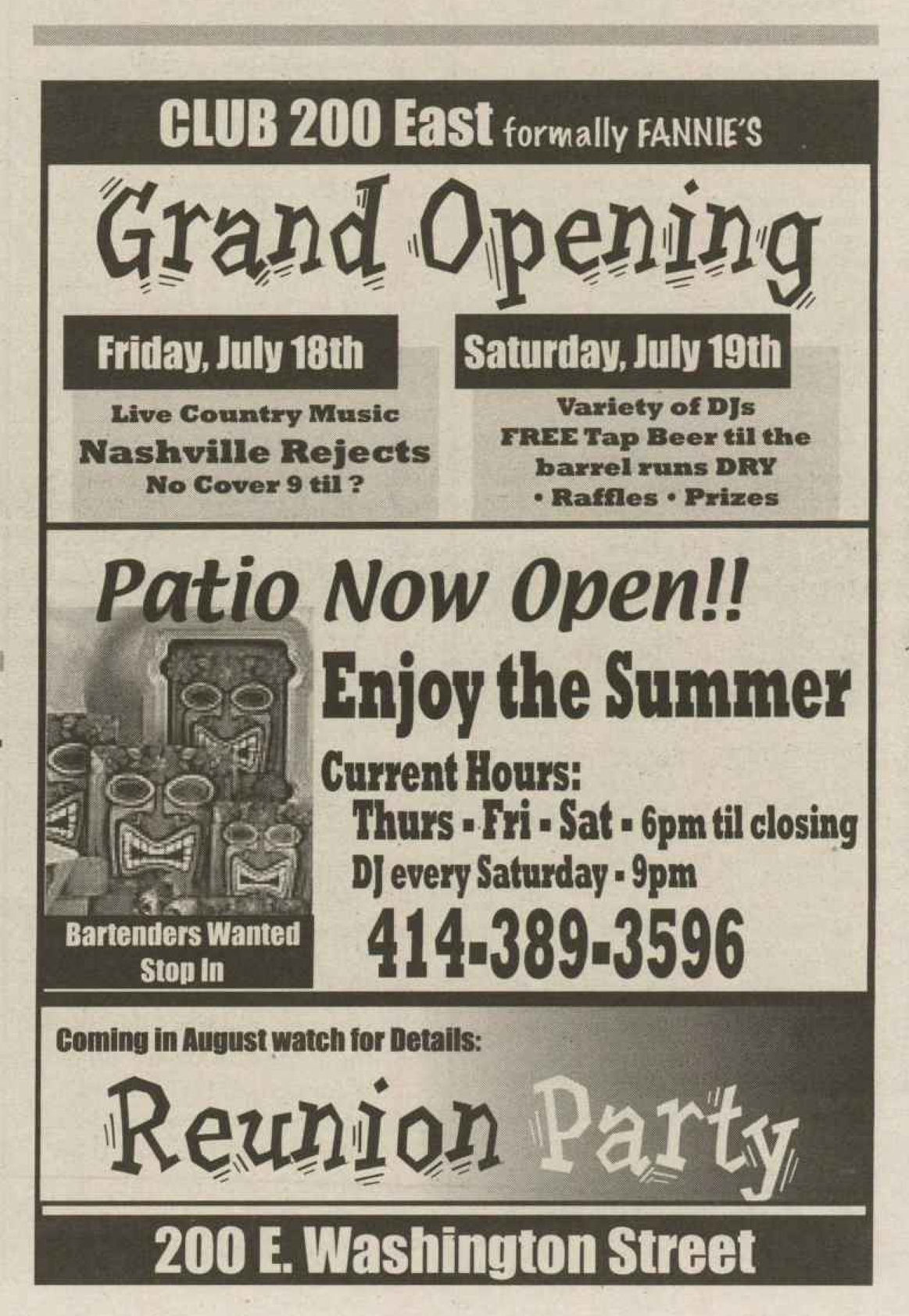 This bar was opened in the building that had previously been the site of Fannie's, a long-time popular lesbian bar (1983-2000) owned and run by Sharon Dixon. After the problems associated with 'Fannies', Sharon first reopened the tavern as Pulse (2002-2004). According to some reports, the location then briefly held a 'straight' rap bar. Trying once more to regain the bar's former popularity within the LGBT community, Sharon opened the location's doors once more in June 2008 as "Club 200 East". That name didn't last long though, as on the stroke of midnight New Years Eve 2007/ New Years Day 2008, the bar was renamed "Jack". This reincarnation didn't last long; it quietly closed early in 2011 (last listed in Wis. Gazette vol. 2-10). The building at 200 E. Washington was the location of a total of six LGBTQ bars: