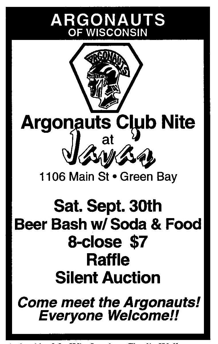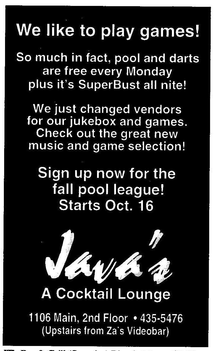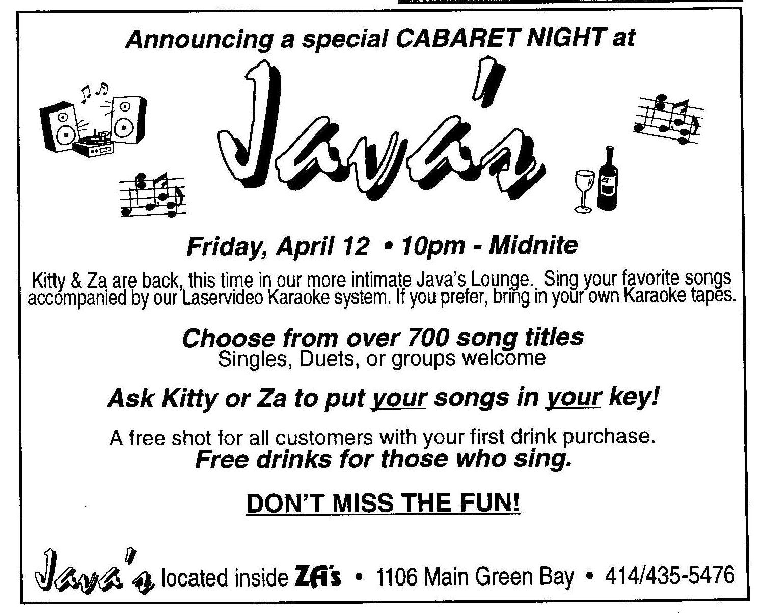 Java's was first seen in advertising in 1994 as 'Green Bay's Newest place to cocktail'. The ad goes on to read 'Java's features a relaxing atmosphere in a Victorian Era bar setting. Pool table, dart machine and jukebox available for your enoyment.' The address reads '1106 Main Street (Upstairs) Green Bay', which is coincidentally upstairs from the popular Za's bar. Future ads include those for a Argonauts club night, and another annoucing a cabaret night which reads 'our more intimate Java's lounge' and specifies it as being 'inside ZA's'. We will be researching the dates this bar was listed in the media bar Guides to try to narrow the timeline. Any additional information is available from anyone willing to contribute it. |
