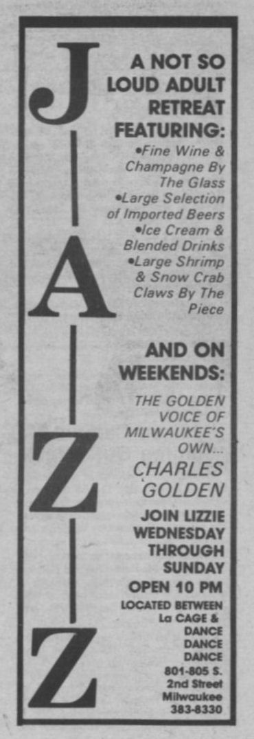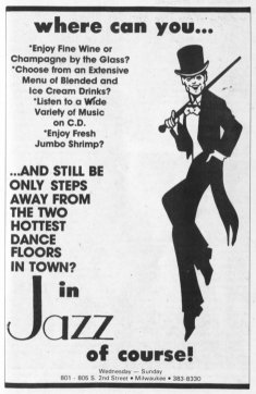 Part of the La Cage complex, Jazz was announced as "A not so loud adult retreat, featuring fine wine and champagne by the glass; large selection of imported beers; ice cream and blended drinks; large shrimp and snow crab claws by the piece". It also featured, on the weekeneds, "the golden voice of Milwaukee's own Charles Golden". Jazz was nestled between La Cage (the original club) and Dance Dance Dance (the dance and show space). In 1990, the La Cage building main floor was extensively remodeled, and Jazz disappeared. |