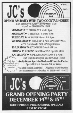 JC's Rainbow Bar was opened by J.C. (Joel Castillo), and managed by Wade Twamley. JC's was open for just five months until being closed due to health problems of the owner. Many of the staff and customers moved to a new bar, the Rainbow Revue. In 2010, a photo album of photos and clippings from the bar's existence came to light. Assembled at the time by the bar's manager, Wade Twamley, the album was donated by Wade to the UWM Archives' LGBT Collection. See the album at this link. The album can also be viewed at the UWM Archives by request. More information about this business is welcomed from anyone who can contribute it. |