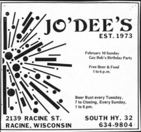View the Images & Articles Gallery page. JoDees was a fixture in Wisconsin's gay/lesbian bar scene for nearly as long as any other LGBT bar, starting at least in 1970. It was a Racine and southeastern Wisconsin tradition as well, continuing to attract a healthy and diverse business (both gay men and lesbian women) year after year. A listing for "Jo-Dee's" at this address first appeared in the 1971 International Guild Guide (published in 1970), with codes G, L, D, WE (Gay, Lesbian, Dance, Weekends), and the note "Good spot for a girl on her own. Dancing encouraged. very friendly." Advertising for Jodee's Club first appears in the February 1972 issue of the GPU News. In the August 1973 issue of GPU News, an ad appears advertising "The New Jo Dee's, Racine's Gayest Club, under new management". (Note the subtle change in spelling of the name.) By 2006 JoDees was in 3rd place for the longest continuously open gay bar in the state, still with the same owner (Judy). Only This Is It (Milwaukee, opened 1968, and still operated by the original owner's son) and BallGame (Milwaukee, opened 1971, and still owned by one of the two original owners) were open longer. BallGame closed in 2012, leaving JoDees and This Is It alone. The winter of 2013-2014 was brutal, with extreme low temperatures and snow. Meanwhile, virtually all LGBT bars were struggling to remain relevant and keep their business model alive. According to a contributor, as of Friday May 16 2014, Jo dee`s in Racine Wi was closed permanently. (They reportedly lost their liquor license and owed a large electric bill from the long cold winter, although this is unverified.) A sorry ending to a fun place.