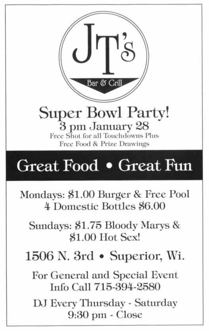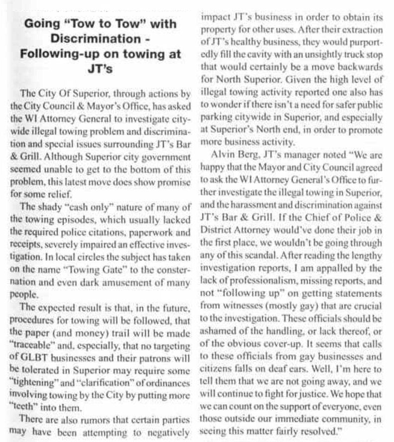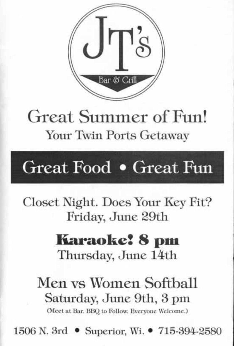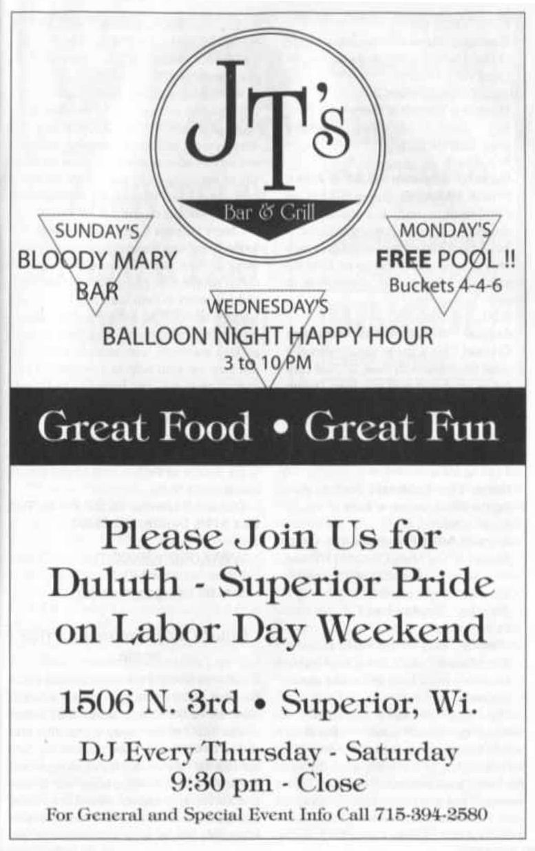 We are still searching for more information about JT's Bar & Grill in Superior. It is listed in the Bar Guides in various Wisconsin LGBT media from about 2000 on, but we lose track of it around 2015. The only advertising or articles we have located thus far are in the short-lived publication G-Street magazine" in 2001. Google images show the bar with "JT's Bar & Grill" signage in October 2008, but the next image, from July 2012, shows a sign partially blocked reading "XXXnanigan's Bar & Grill". and the image from October 2012 shows the bar as "The Whiskey Ward" so obviously "JT's Bar & Grill" closed sometime prior to July 2012. We found one on-line review for JT's dated 2010 but that is the last solid reference we have for JT's existence. More information about this business is welcome from anyone who can contribute same.