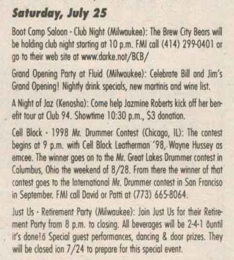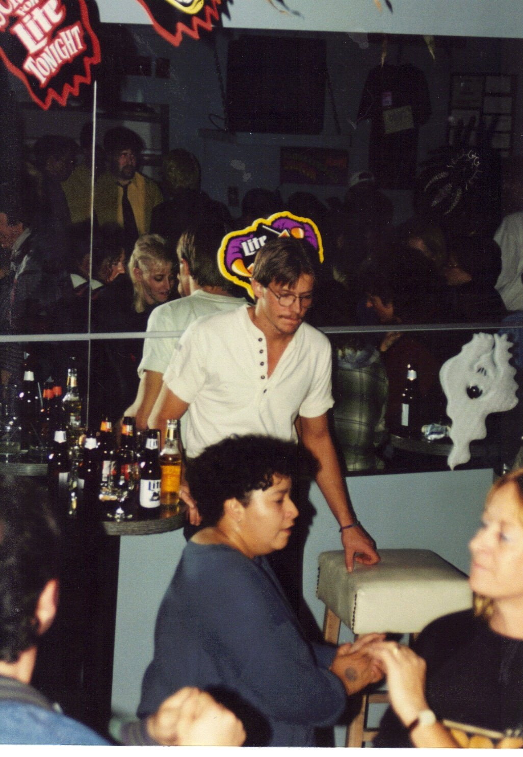 ---> Just Us was probably the most equally mixed (men vs. woman) gay bar I have ever seen in Milwaukee. I was sent there on photo shoots a few times over the 4 years it was open. I was covering a drag event there once and brought a date (Don) with me. Let me tell you, it probably wasn’t fair to bring a date on photo shoots. I often had to leave the person standing all by themselves while I was running around getting pictures. This was probably our second date and Don’s first date with me while I was on a photo shoot. We had a couple of shots (he didn’t do shots back then) and a couple of drinks. Halfway through the shoot I looked over at Don and he looked as if he was doing his best to “keep it together.” I went over and asked if he was ok and he said no. I took him to the bathroom where he puked. I felt so bad for him. I know it embarrassed the hell out of him and a couple people came in to make sure we were ok, making it even more embarrassing. I cut the photo shoot short and we went to my car where I called his wife (they were separating at the time) from my car phone (yes back when they were installed) to tell her Don was way too drunk to come home. She was NOT happy. I took him home and tucked him in bed.