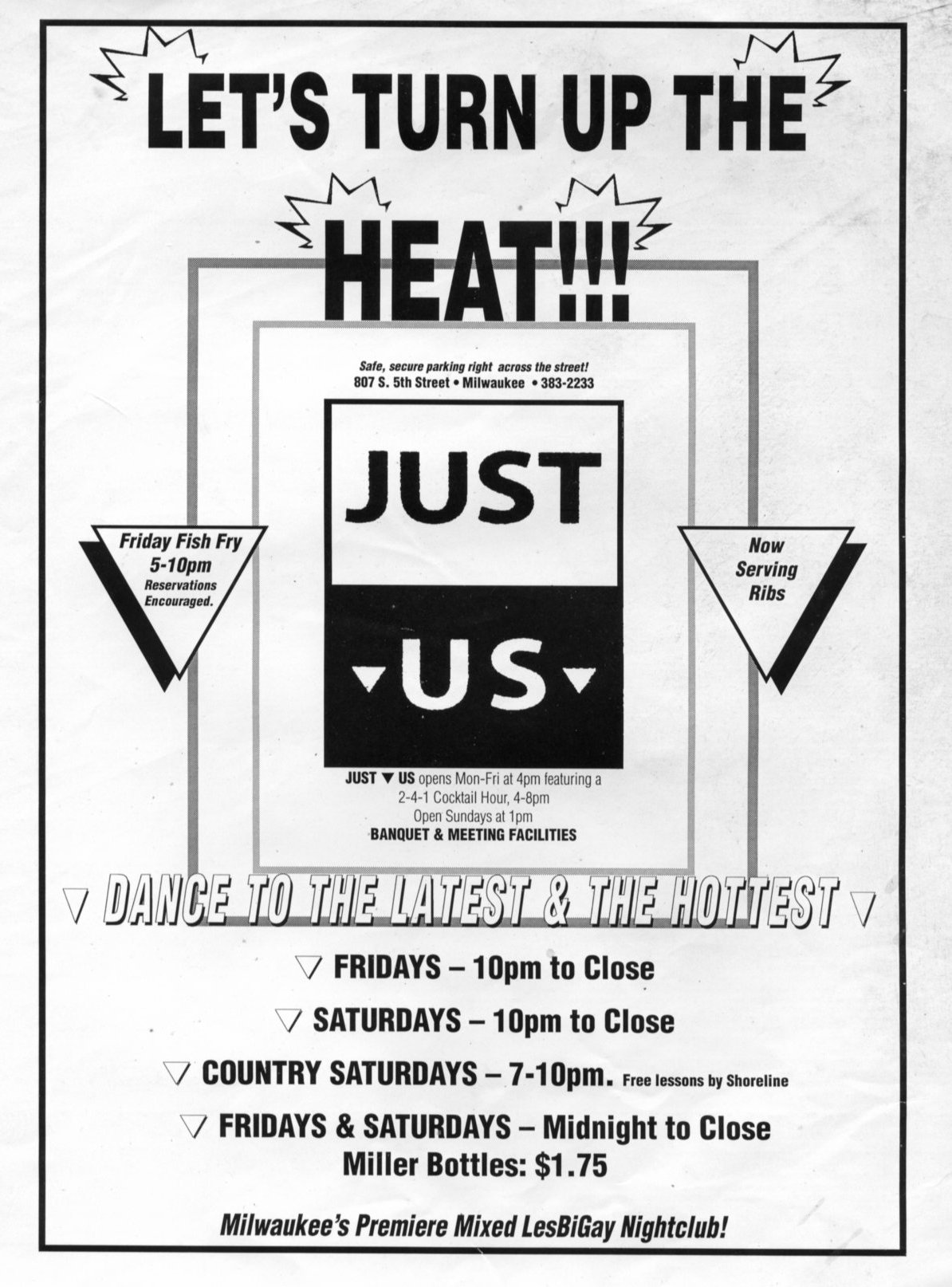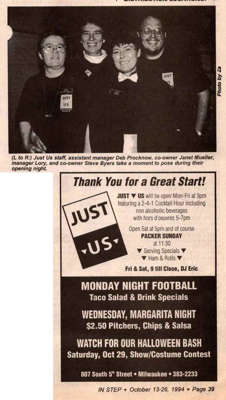 Just Us was opened by an attorney from Kenosha (Steve Byers), and a lesbian from Milwaukee (Janet Mueller), and was managed by Lory- who was decked out in a tux for opening night. It is remembered by many as one of the most equally mixed 'LesGay' (men vs. woman) gay bar Milwaukee had seen to date. The bar had a patio, a variety of non-alcoholic drinks, a nice cocktail hour and many weekends there were drag shows or pageants. (Steve Byers did drag from time to time.)