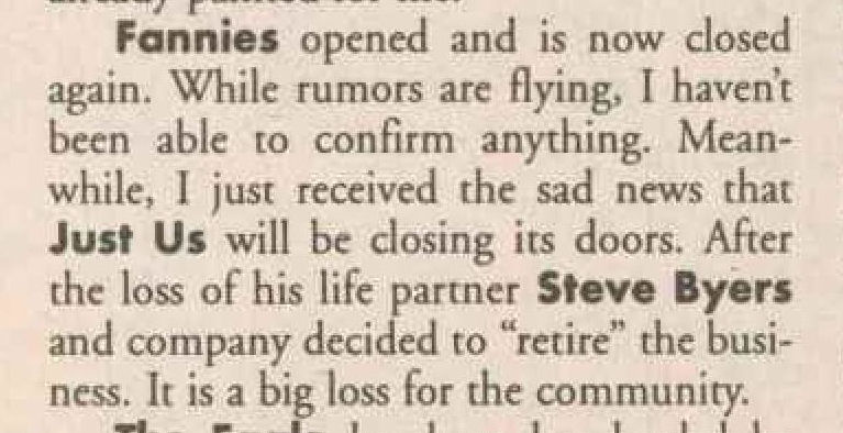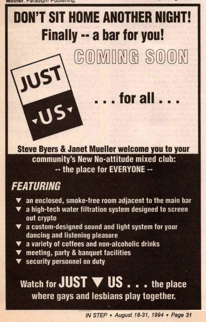 Unfortunately, the bar didn't last as long as many had hoped. In June 1998, the owners announced that Just Us would be closing. One of the co-owners, Steve Buyers, had recently lost his partner, and Steve decided it was time to move on. The bar held their "Retirement Party" on July 24 and 25 and closed thereafter. (It continued to appear in Bar Directories of In Step newspaper until October, as the guide was only infrequently updated.)