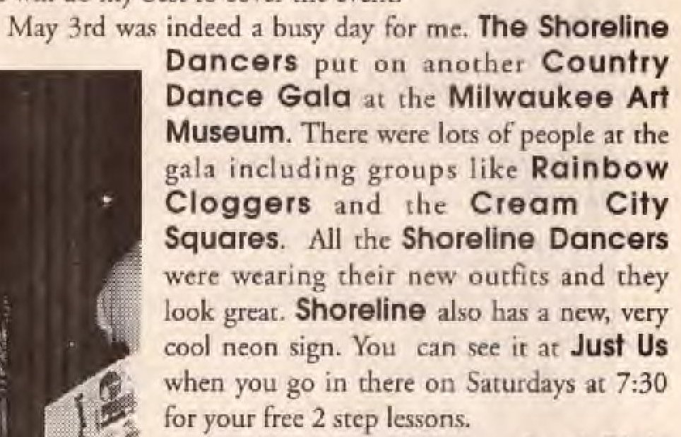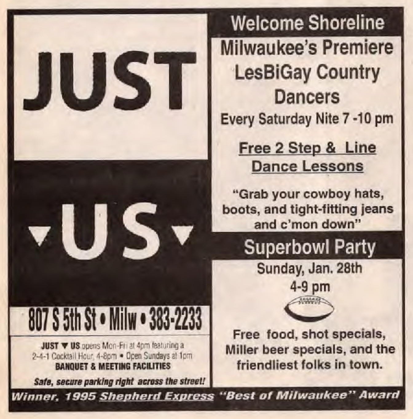 Ad: Shoreline LesBiGay Country Dancers every Saturday night; + Superbowl Party