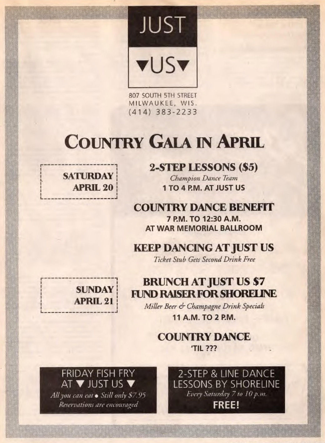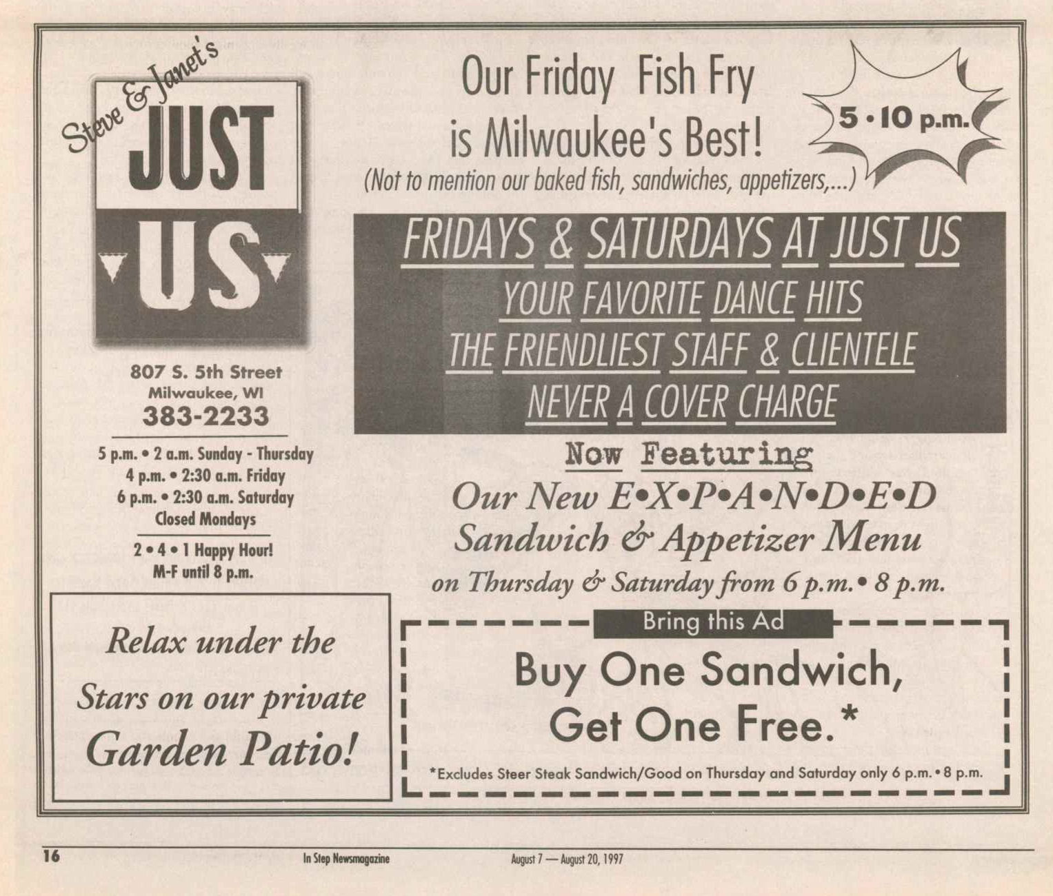 Ad: Fridays & Saturdays Dance Hits; Best Friday Fish Fry; Garden Patio