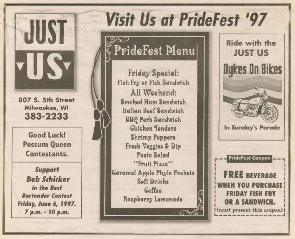 Ad: Just Us food menu at Pridefest