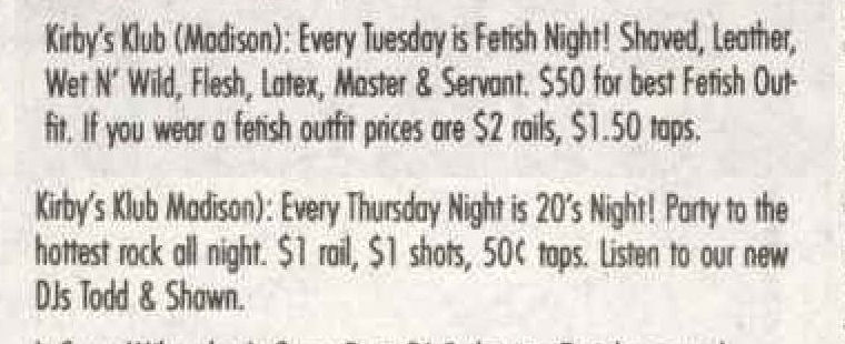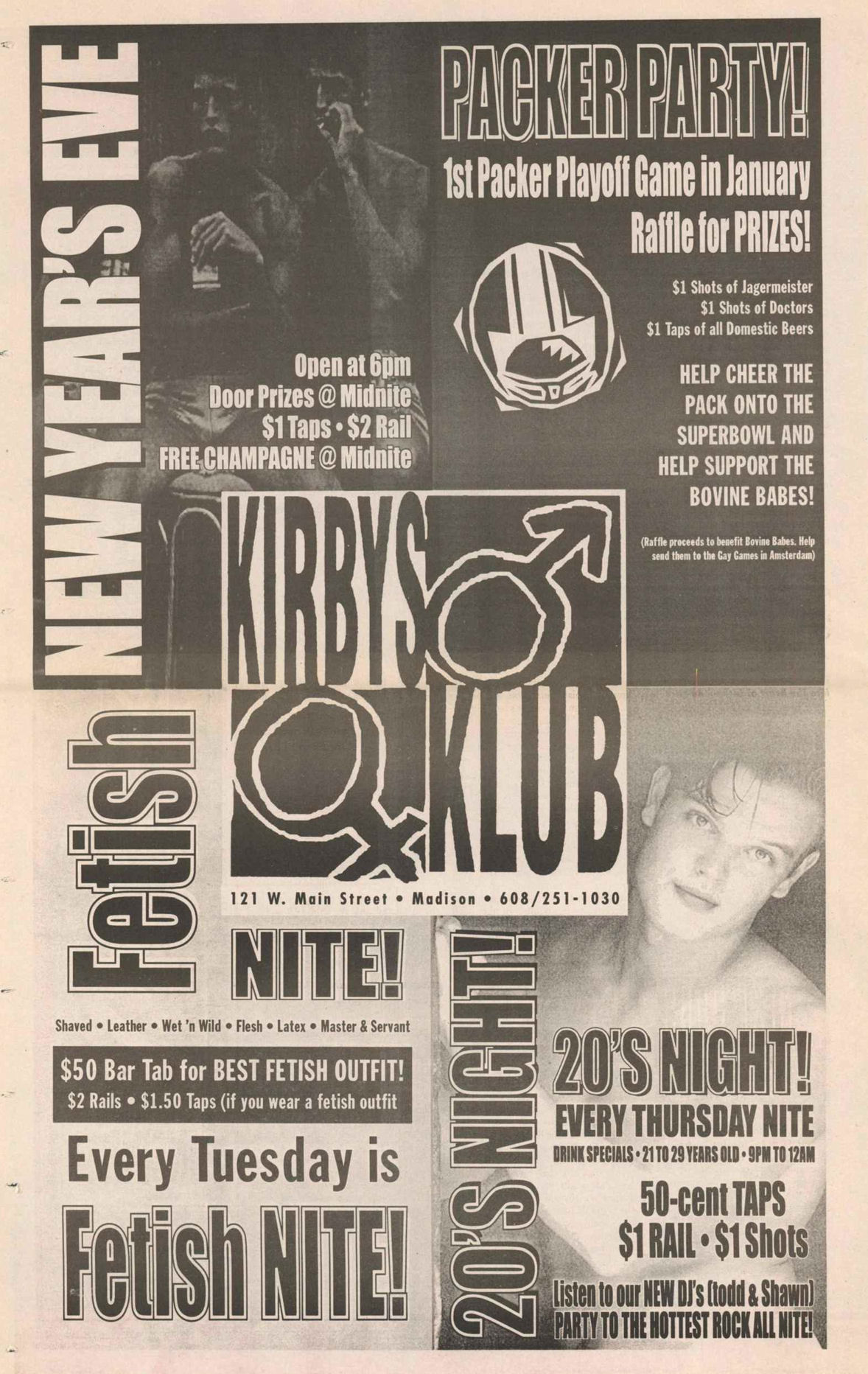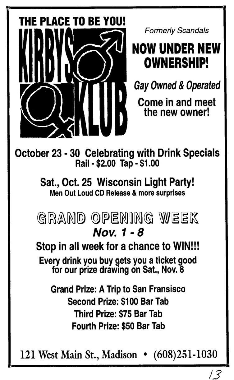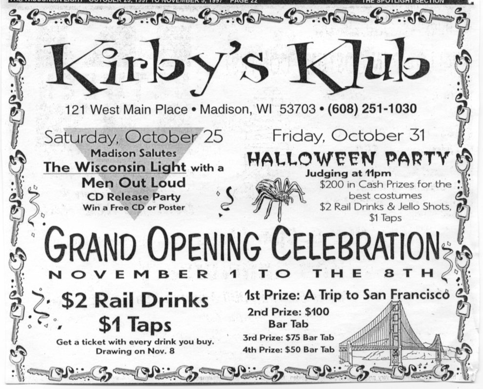 Kirby's Klub was opened by Kirby Sheldon in a space that might have given some second thoughts. The location had held two LGBT bars in less than 2 years: first "R Place" (May-December 1996) and then "Scandals" (March-October 1997). Understandably though, the parents of the owner of the original gay bar on the site, R Place, were not keen on operating a 'gay' bar that their son had abandoned and left in their care (which they had tongue-in-cheek temporarily reopened 'Scandals'). And thus a notice appeared in October 1997 that owners Mike and Nancy handed over the keys to Kirby Sheldon and the place would be called Kirby's Klub. In Quest issue 4-18, an advertisment appeared for the new bar called "Kirby's Klub", reading "Formerly Scandals" and then "Now under new ownership! Gay owned & operated". A listing in one issue reads "Just opened in what was Scandals building. Now gay owned & operated. Features backroom dance floor & fireplace". Later listings expanded the description as "Dancebar, Jukebox, Pool, Darts. Gay owned & operated. Features backroom dance floor, pool hall & sitting room with a fireplace". After just under two years in business, Kirby's Klub closed suddenly in July 1999, and was reopened as "Millenium". But once again the business didn't last long-- by August it had reopened again as yet another bar, named Rainbow Room. Kirby's Klub was thus the third in a long line of names for an LGBT bar in this location (121 W. Main Street, Madison) over a period of just 4 years: