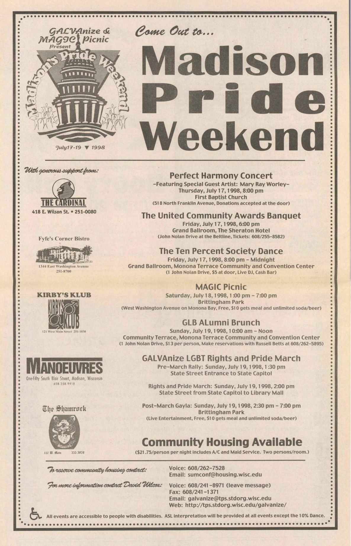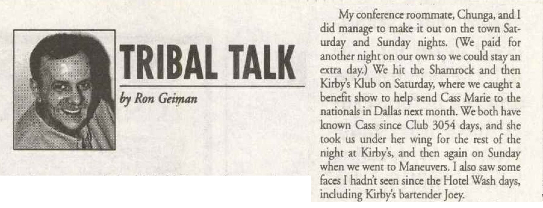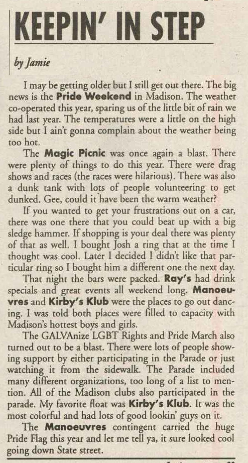 Kirby's Klub was opened by Kirby Sheldon in a space that might have given some second thoughts. The location had held two LGBT bars in less than 2 years: first "R Place" (May-December 1996) and then "Scandals" (March-October 1997). Understandably though, the parents of the owner of the original gay bar on the site, R Place, were not keen on operating a 'gay' bar that their son had abandoned and left in their care (which they had tongue-in-cheek temporarily reopened 'Scandals'). And thus a notice appeared in October 1997 that owners Mike and Nancy handed over the keys to Kirby Sheldon and the place would be called Kirby's Klub. In Quest issue 4-18, an advertisment appeared for the new bar called "Kirby's Klub", reading "Formerly Scandals" and then "Now under new ownership! Gay owned & operated". A listing in one issue reads "Just opened in what was Scandals building. Now gay owned & operated. Features backroom dance floor & fireplace". Later listings expanded the description as "Dancebar, Jukebox, Pool, Darts. Gay owned & operated. Features backroom dance floor, pool hall & sitting room with a fireplace". After just under two years in business, Kirby's Klub closed suddenly in July 1999, and was reopened as "Millenium". But once again the business didn't last long-- by August it had reopened again as yet another bar, named Rainbow Room. Kirby's Klub was thus the third in a long line of names for an LGBT bar in this location (121 W. Main Street, Madison) over a period of just 4 years: