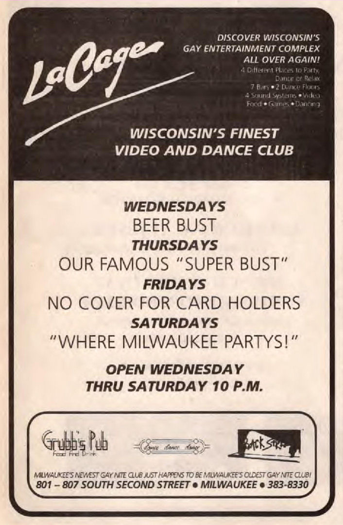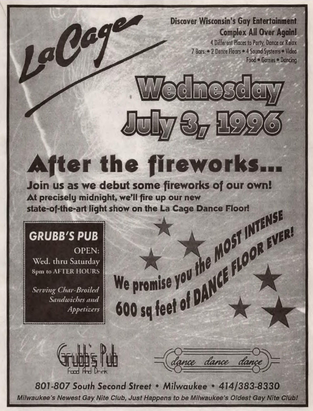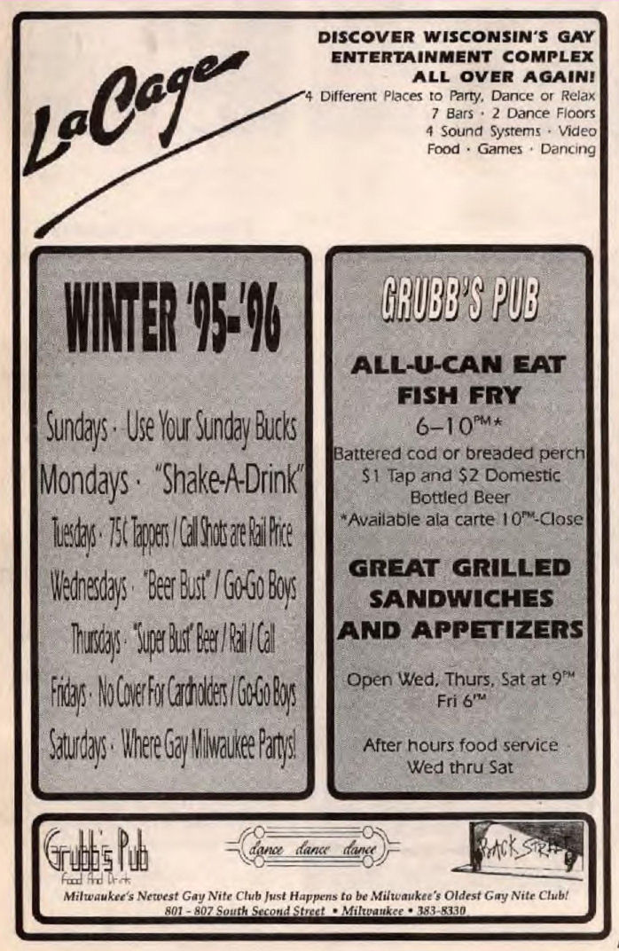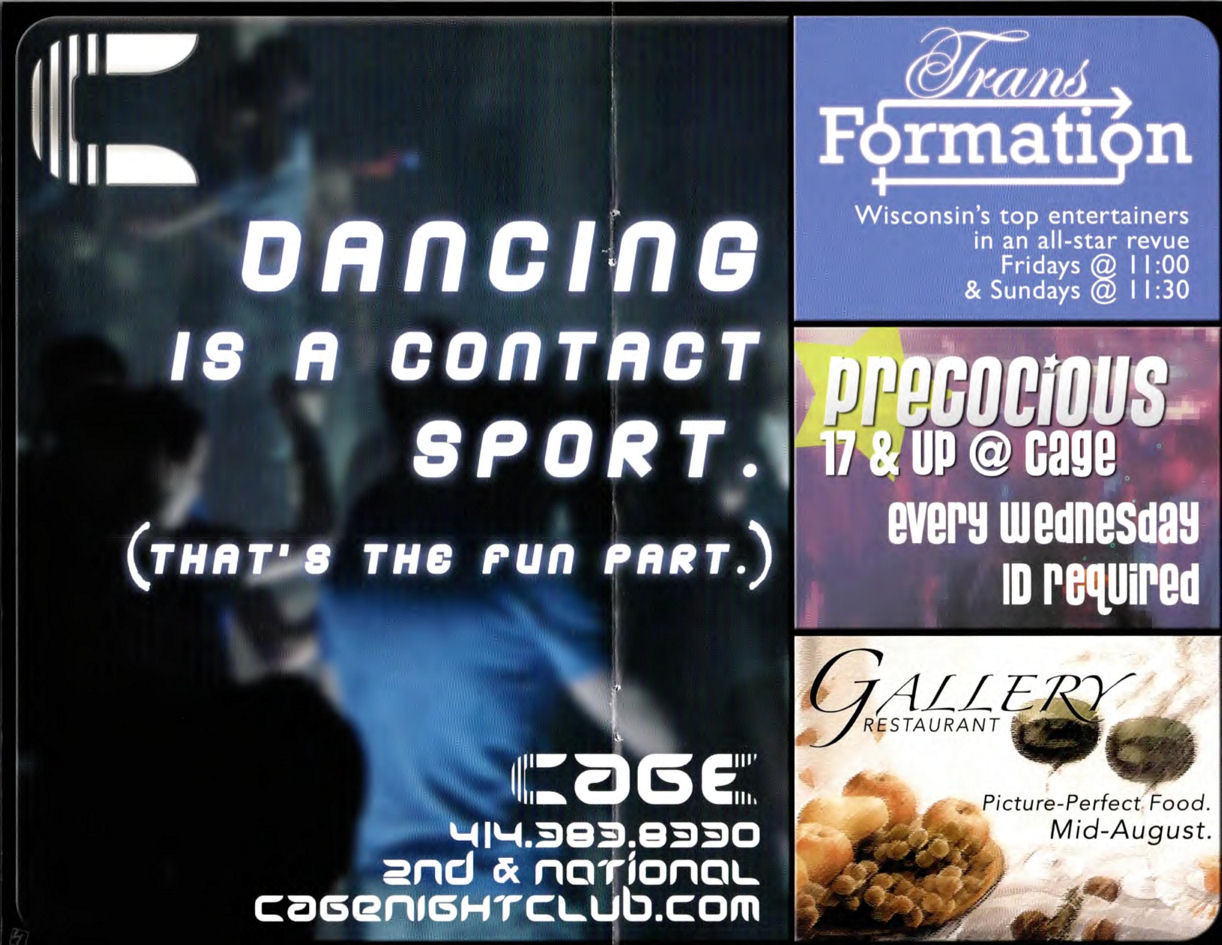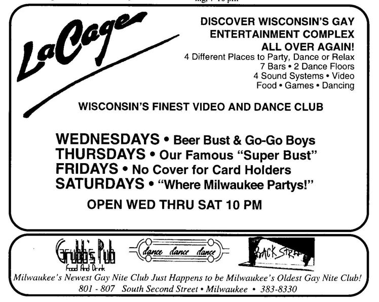 Ad: Discover Wisconsin's Gay Entertainment Complex: 4 different place to party, dance or relax; 7 bars, 2 dance floors, 4 sound systems