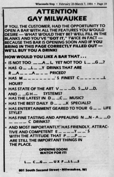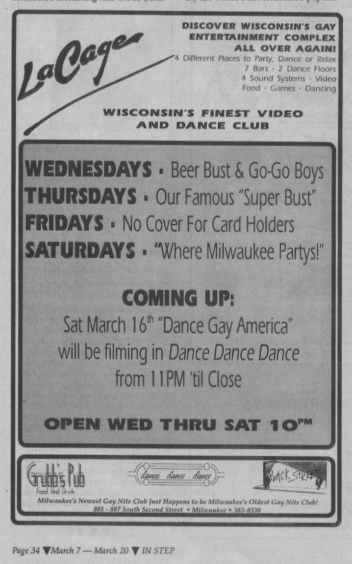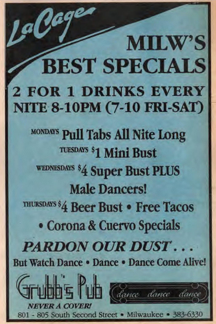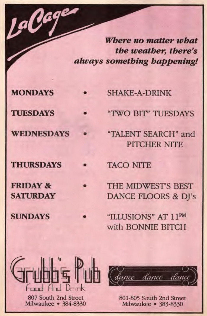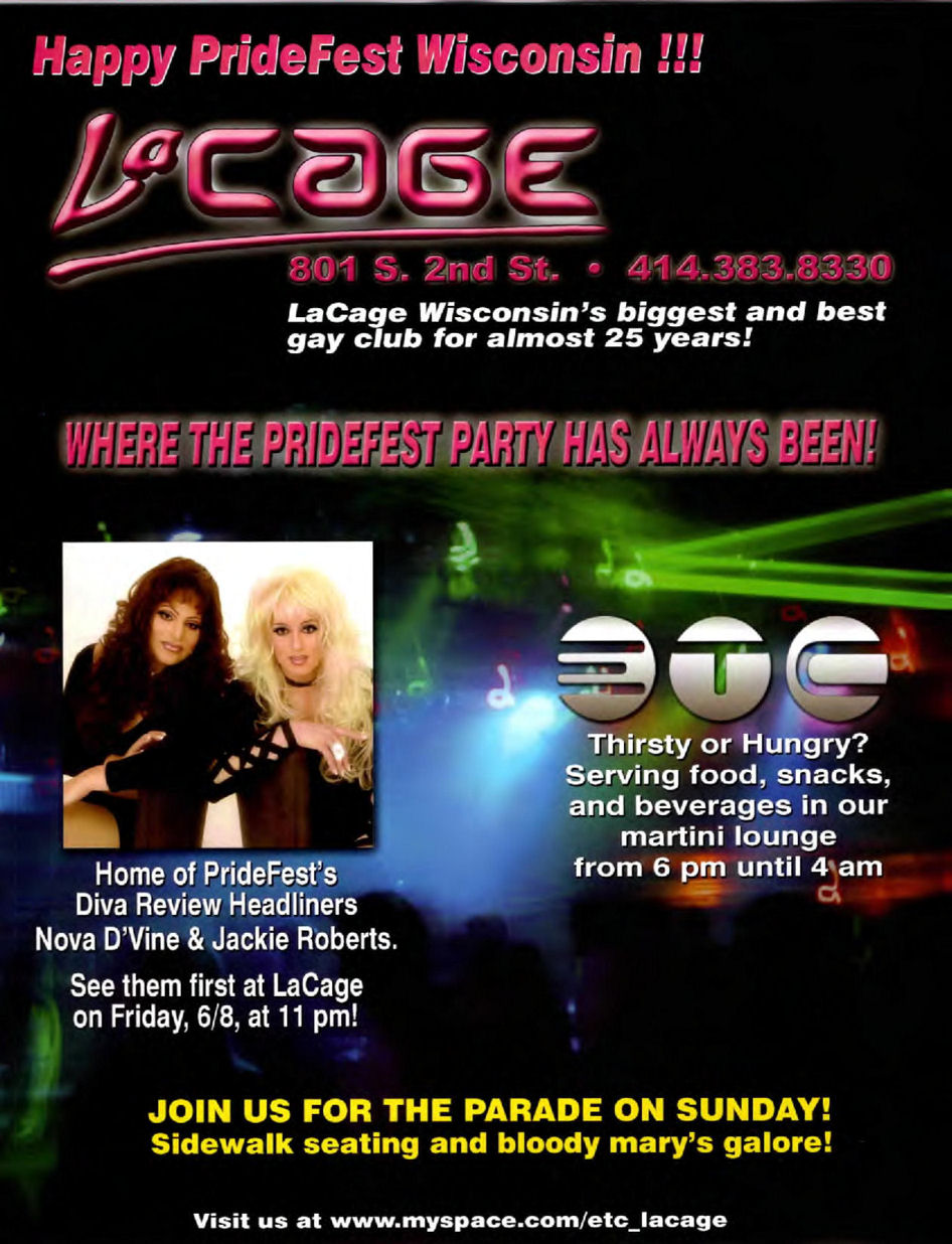 Ad: Discover Wisconsin's Gay Entertainment Complex: 4 different place to party, dance or relax; 7 bars, 2 dance floors, 4 sound systems