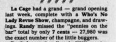 Steppin' Out, excerpt: La Cage Grand Opening, with Who's No Lady Revue, and contest guessing pennies on the bar (27,980 is the supposed number)