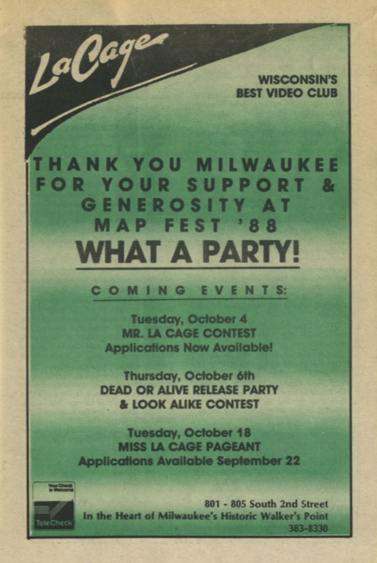 Ad: La Cage thanks the community for MAP Fest '88 success