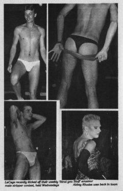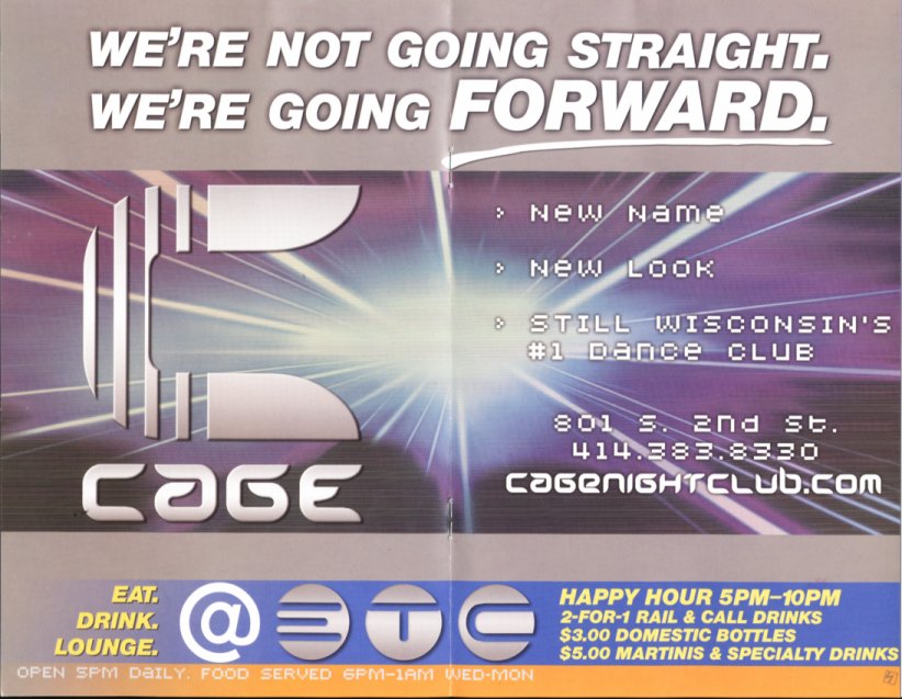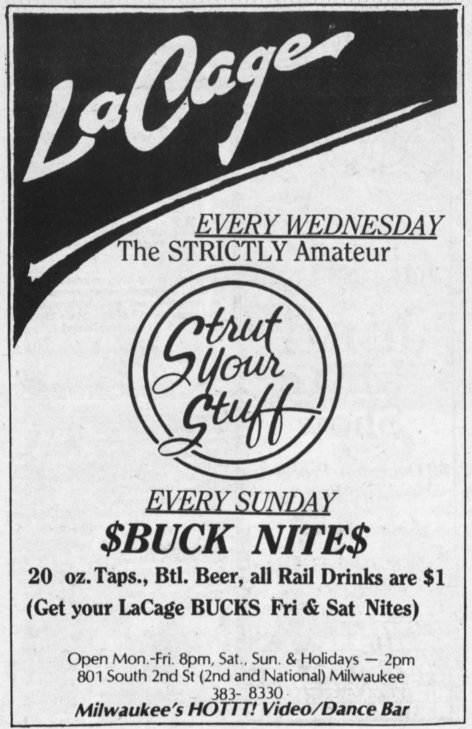 La Cage Aux Folles began as a dance bar, and was relatively popular from day 1. Upon its opening, it is also believed to be the first bar with windows open to the street (closely followed by the M&M Club, which opened theirs within a month or two). Although the dance area was not large, the location and timing was excellent, and La Cage quickly took dominance of the gay dance scene, largely helped by DJ Tony Aiello, who presided as DJ at La Cage for almost 20 years. La Cage quickly overtook Club 219 as the city's premier gay dance bar, and over the next few years competing venues such as Factory II closed. The bar continued to keep a good and loyal share of the dance crowd market as dance venues such as Kisses, Factory III, and others came and went. Over the years, La Cage evolved. In 1988 the area of the building to the south of the La Cage bar opened as the separate but connected "Dance, Dance, Dance". About the same time, as separate area called Jazz was opened, advertised as "A not so loud adult retreat", featuring fine wine and champagne by the glass, ice cream and blended drinks, and other special touches. La Cage was also known as the bar that never stayed the same. The owner was never satisfied, and it seemed every year or two the bar underwent a drastic remodeling: bars would be ripped out and pop up against another wall, the dance floor would move and shift, the DJ booth would be remodeled, video screens came and went, etc. The building became a small complex, with varying degrees of success. An outdoor patio was somewhat popular, but the limited summer season, and the bar's main draw as a dance bar, caused the patio to quitely go away after a season or two. A basement restaurant named "Grubb's Pub" opened in October 1990 was more successful, expanding over time from just grilled fare to sanddwiches and later to lite dinner entrees. That space also offered something of a refuge from the louder music above, and there was regular traffic between the two floors. "Grubb's Pub" was resurrected in 2003 as "etc". La Cage was also the source of some controversy. In the relatively conservative Milwaukee market, La Cage's habit of charging cover charges well above the average for a Milwaukee gay bar often caused grumbling, and the bar's habit of both charging for "prefered-member" cards, and invalidating and forcing people to buy new cards after just a year, was further criticism. Through it all, there was a loyal following. There were also some comments that La Cage was catering too much to the straight clientele; although, located as it is in the midst of several popular straight bars, that is almost unavoidable. There were also occasional rumors about large tax debts of the business. Early in 2004, La Cage was remodeled again, this time tearing out the entire center of the building to creat one large room: a large dance floor in the center surrounded by bars, tables, walkways. In July, the club was renamed from "La Cage" to simply "Cage". The "too straight" mumbles started again, and the new "Cage" began advertising "We're not going Straight, We're going Forward". On November 1, 2005, after nearly 20 years, the bar saw a change of ownership: original owners George Prentice and Corey Grubb sold the bar and retired to sunny Florida. New owners Michael Jost and Kris Heindel took over the reins and re-adopted the old "La Cage" name. Under their helm, there was much less controversy and fewer rumors. What didn't change was the bar's popularity: it's dance music, location, and community involvement caused it to remain the most popular bar in the city, especially among the younger dance crowd. On March 20, 2009, the bar hit its 25th anniversary, and celebrated in grand fashion with a special party on Friday, April 24th, 2009, at which copies of advertising from the previous 25 years were displayed (created for the bar by this History Project). And after countless rumors over the years, the second floor was under construction, due to open as a new dance and show place for drag and other shows. (The upstairs opened as "Montage" in July 2009). Through subsequent years, the bar's original owners (George and Corey) took back ownership, and the bar prevailed as the primary dance bar in Milwaukee- attracting both the LGBTQ crowd, but also continuing to attract 'straight' people looking for a mainstream dance bar. The second floor lounge became know for its show, espcially drag shows as drag performance made a comback in the mid-2010's. The bar lasted through the COVID-19 pandemic and beyond, still going strong in 2023. It seems clear that La Cage will continue to be at the center of LGBTQ bar activity in Milwaukee for some time to come. Read the A 2024 History of the bar and building's history; (links to 'onMilwaukee.com' website). Read the 25th Anniversary article from Q-Life Newspaper. Recollections: The following are recollections of others who have been kind enough to submit their personal memories to the webmaster. You are welcome to do the same! (Recollections collected and organized by Jamie Taylor.) ---> "Original LaCage owner George Prentice had previously owned a restaurant called Auctioneer's Inn II in Elm Grove. Two famous fixtures in LaCage originated there. One was a brass bank entrance, which was transplanted from the Inn to the corner entrance of 2nd and National, as the main entrance to La Cage; the brass entrance remained there for many years. Also, Auctioneer's Inn had a bar that had numerous pennies embedded and lacquered into the top; that bar inspired the penny-top bar that was created in the LaCage." |