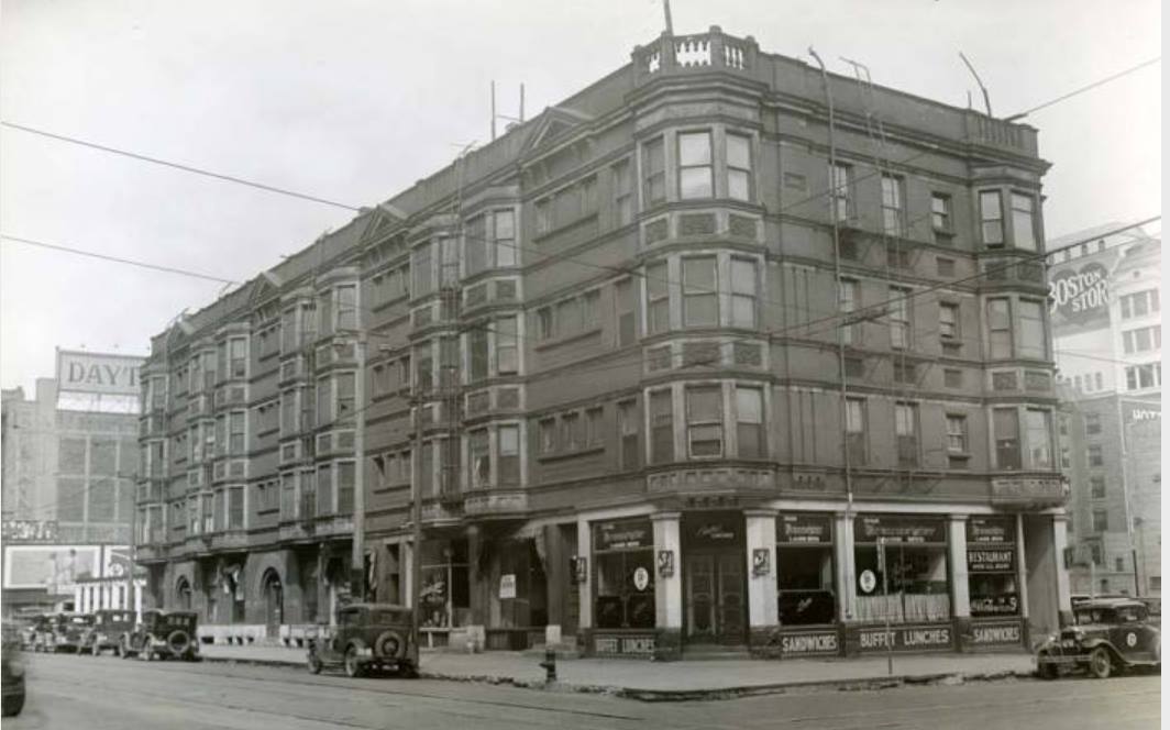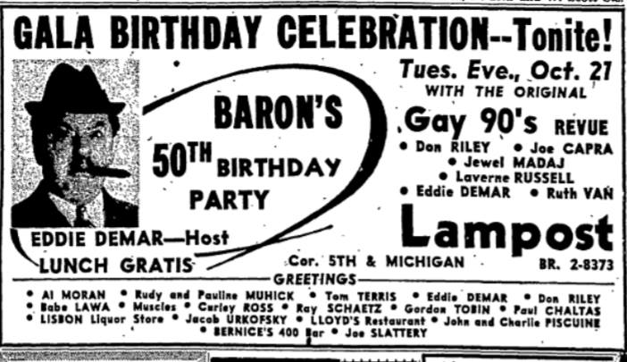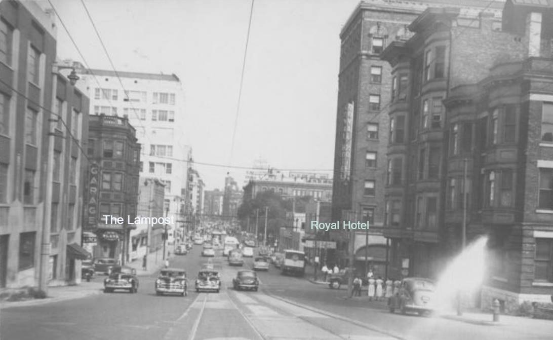 Although exact dates that the Lampost Bar existed are unknown, the known information of the bar is related by researcher Michail Takach in a November 2018 posting in the Facebook group: "On July 10, 1958, Samuel Eskin was arrested for "pandering" at the Lampost (440 W. Michigan St.) He lost his bartender's license, was sent for psychiatric evaluation, and was put on a one-year probation. He was also forbidden from returning to the Lampost Bar. "Why? Because "pandering" at the time was a keyword for "pimping," and Eskin was known to arrange meetings between men and other men -- in private rooms at the Royal Hotel across the street. He was finally caught in 1958 when he set up a patrolman with a male "date." The owners denied any knowledge of Eskin's dealings and ended his employment. "As a long-time underground gambling venue, the "old Lamp Post Tavern" was bombarded by federal raids in the early 1960s. Tips on horse races, sports games and boxing matches were phoned in from the bar to Los Angeles and New York. Lampost owners, brother Charles and John Piscuine, were charged with illegal gambling several times. "The bar sparked controversy in 1960 and 1962 for allowing female performers Martha Artis and Julie Davis to sit at the bar and socialize with patrons after their shows. This behavior was banned by Milwaukee city ordinance since the "come-on girl" epidemic of the 1930s. The Piscuines asked Judge Christ Seraphim to consider if that ordinance might be out of date and out of touch for 1960s liberal Milwaukee. Ulitimately, they and their performers were let off the hook with $1 "symbolic" fines. Takach was unable to find a great photo of the latter-day Lampost. He did find an exterior photo of the building from 1933 and a street shot of Michigan Street from 1948. Takach concluded: "Charles Piscuine moved on to manage the Towne Room Bar at the Towne Hotel (723 N. 3rd St.) before his death in 1969. Oddly, his obituary mentions that he will be remembered for his gambling habit." In addition to the Royal Hotel across Michigan street to the south (the bar in which had several LGBT bar identities over the years), across 5th Avenue to the west existed a building that over time housed three LGBT landmarks: the New Yorker Lounge from 1952 to 1975; the Loop Cafe from 1963 to 1970, and The Lib Bookstore from 1971 to 1986, when that building was demolished.