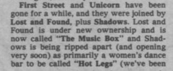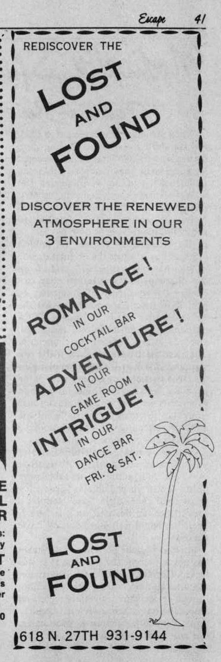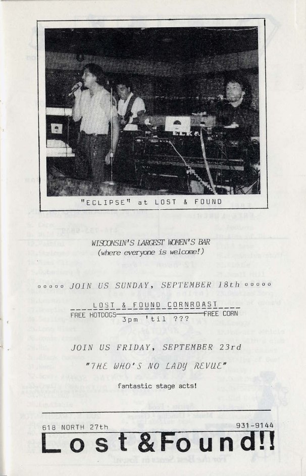 The Lost & Found Bar was for a few years a popular bar on the outskirts of downtown, on North 27th Street just south of Wisconsin Avenue. Owned and managed by Karla Farr, it advertised as "Milwaukee's First Women's Disco" and later as "Wisconsin's Largest Women's Bar (where everyone is welcome)". (Another 'owner', Beverly, is named in a photo published in November 1980.) The bar held various parties, including a regular summer corn roast, and hosted live entertainment at times. By 1981 the bar was hosting a women's softball team (the Honey Bees), to play in the SSBL (Saturday Softball Beer League). However, the bar never seemed to develop a "logo", as its various ads over the years never displayed one. The Lost & Found was closed in Sept. 1984 (right around its 6th anniversary), and reopened (under new ownership) as the Music Box, which only lasted from October 1984 to February 1985. Slightly more successful, but still fleeting, was the 27th Street Danceteria, opened first in March 1985 as an under-age 'juice' bar open until dawn, but to allow dancing needed a liquor license- but still only stayed open until June 1987. Historian Michail Takach wrote the following about this bar in a Facebook post in 2021: October 1978: October 1978: Lost & Found, Wisconsin's first women's disco, opens at 618 N. 27th St. Owned by the mysterious Pete and Bev Nilsson, former operators of the popular Leaded Shade at 157 S. 1st St. (1974-1979,) Lost & Found operated on a "courtesy card" basis for the safety of its guests. Manager Karla Farr created an extremely popular and unique space for women. Lost & Found is remembered as one of the first gay bars to play New Wave music in Milwaukee. By 1980, they began hosting full-length production shows, featuring Miss Gay Wisconsin Patsy Parks, the ever-popular Legs, and other local talent. The bar sponsored softball, bowling and darts teams, as well as a popular annual corn roast. The Nilssons were brave to open a dance club at 27th and Michigan. Car break-ins, muggings and street harassment were already common in the late 1970s. One employee even remembers being mugged for her George Webb burgers after work one night. When the hospitals that once anchored the neighborhood began to close and consolidate, the Avenues West neighborhood went on a steep decline. In September 1984, the Lost & Found closed and reopened under new ownership as The Music Box. It didn't last. The 27th Street Danceteria (1985 - 1987) later opened here: an all-ages, late-night dance club that initially did not serve liquor. Today, it's difficult to imagine LGBTQ clubs near 27th and Wisconsin, but for about a decade, they were there! "Wisconsin's Largest Women's Bar" may have only lasted for six years, but customers still have lasting memories of their time at The Lost & Found.