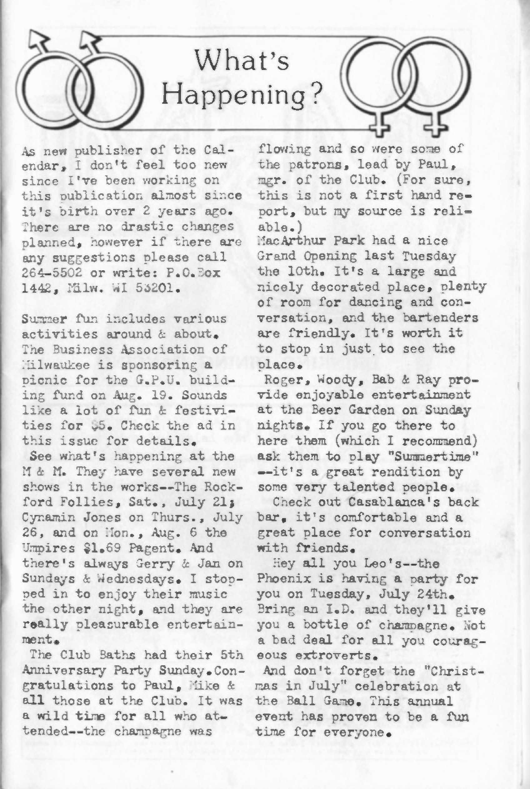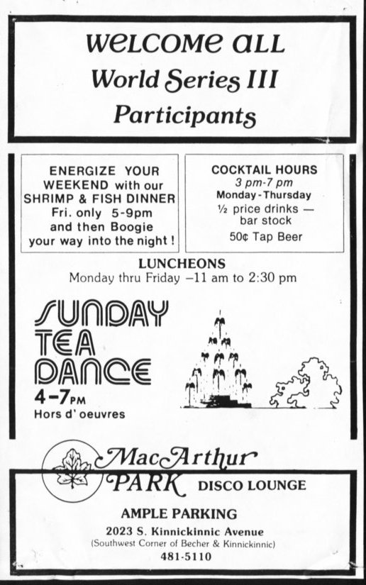 MacArthur Park Disco Lounge likely opened sometime in June 1979, holding its Grand Opening on Tuesday July 10, 1979. This same location had previously been known to Milwaukee's gay community as Red Corvette, which operated from about 1976 to early 1979. The name of the business was likely inspired by the popular 1978 disco song recorded by Donna Summer. According to a mention in the 'Milwaukee Calendar' "What's Happening?" column, MacArthur Park Disco Lounge had a "nice" Grand Opening. It goes on to say "It's a large and nicely decorated place, plenty of room for dancing and conversation, and the bartenders are friendly. It's worth a stop in just to see the place." The same issue of the 'Milwaukee Calendar' had an advertisement stretching across two full pages (see below). The ad advertised Friday Shrimp & Fish Dinners, and lists Luncheon hours Monday thru Friday- along with apologizing for street construction. The business also had a large ad in the program for the Gay softball 'World Series III', which was held in Milwaukee the weekend of August 28 to September 3, 1979). But after this initial splash, the business disappears. We have no idea when and why it closed, but by the time of the next issue we have of the 'Milwaukee Calendar' in April of 1980, it is not listed. (Or perhaps it no longer wanted to advertise in gay media.) More information about this business is welcomed from anyone who can contribute it.