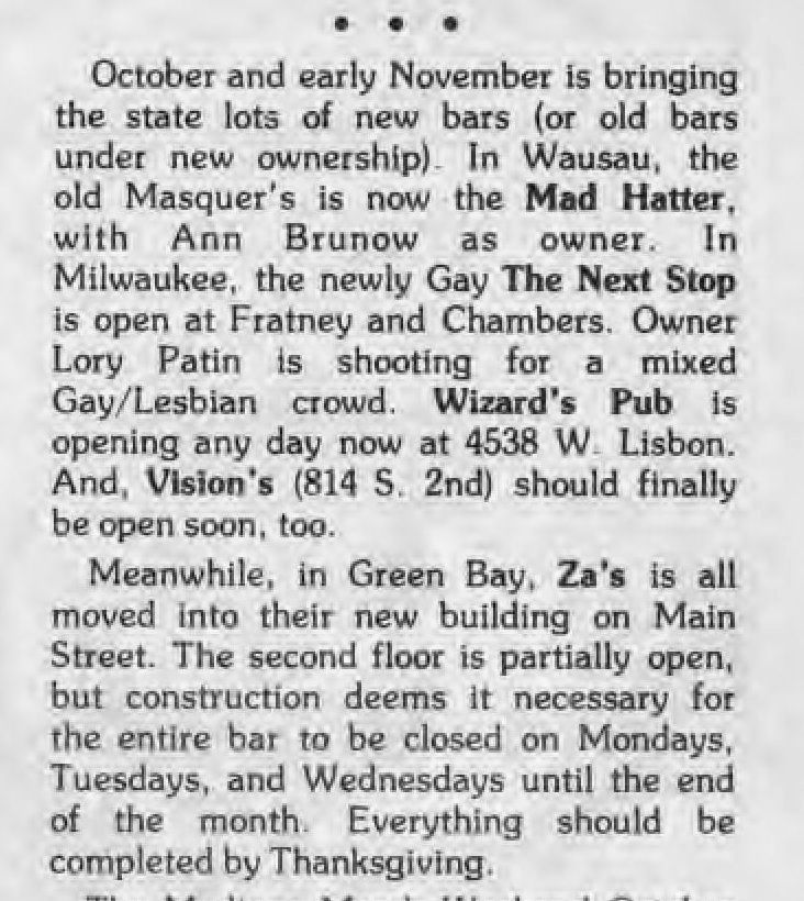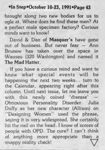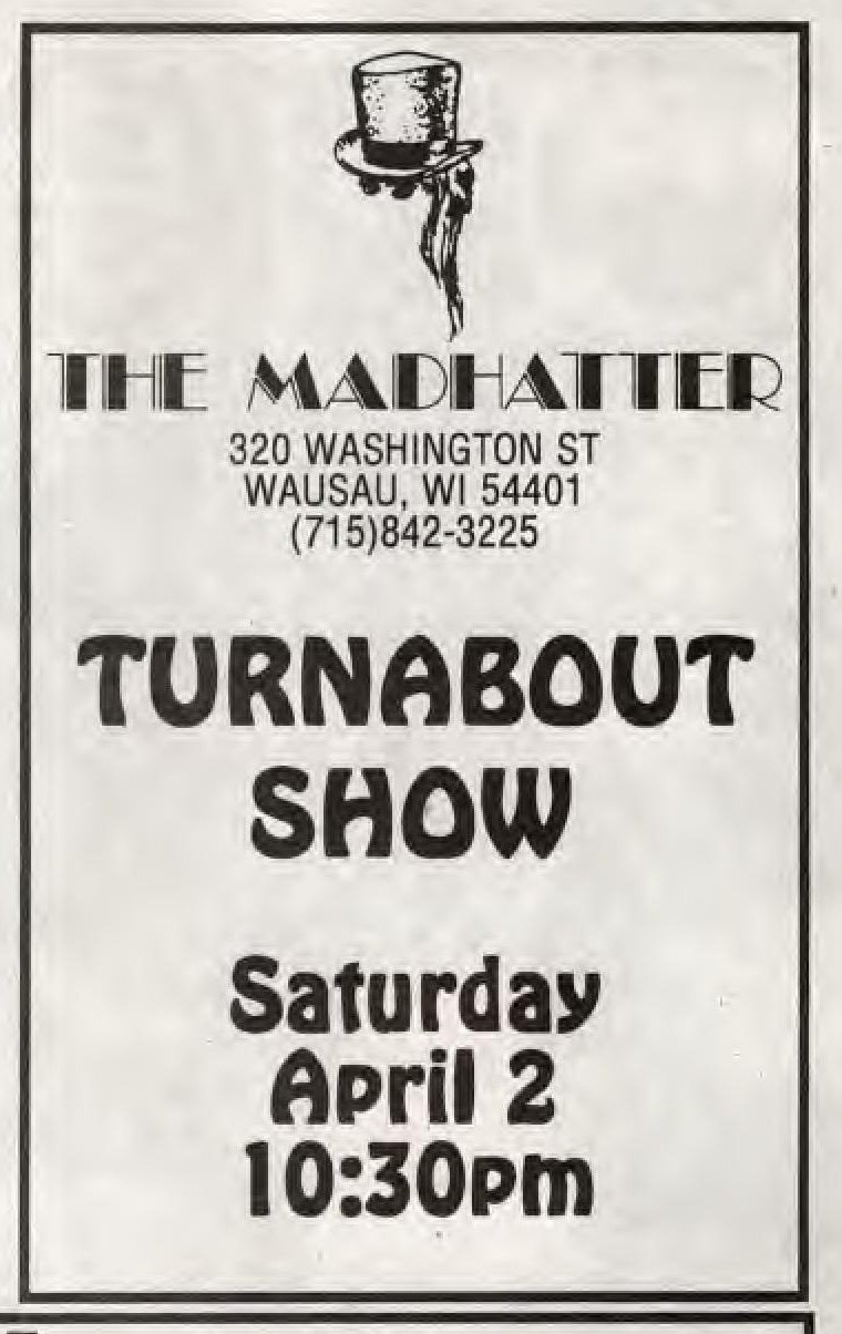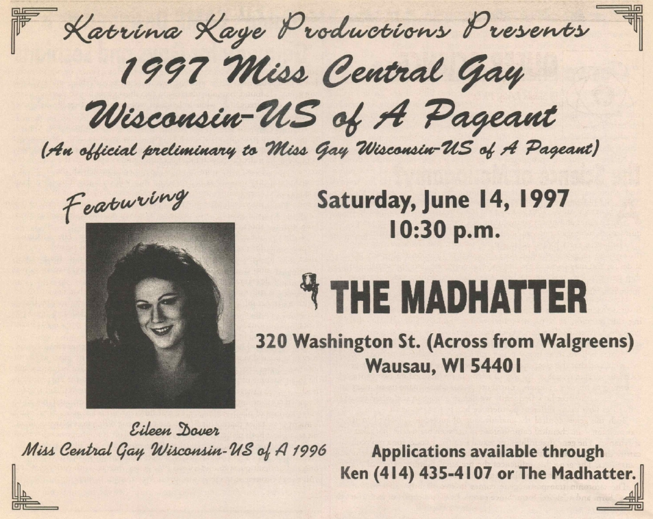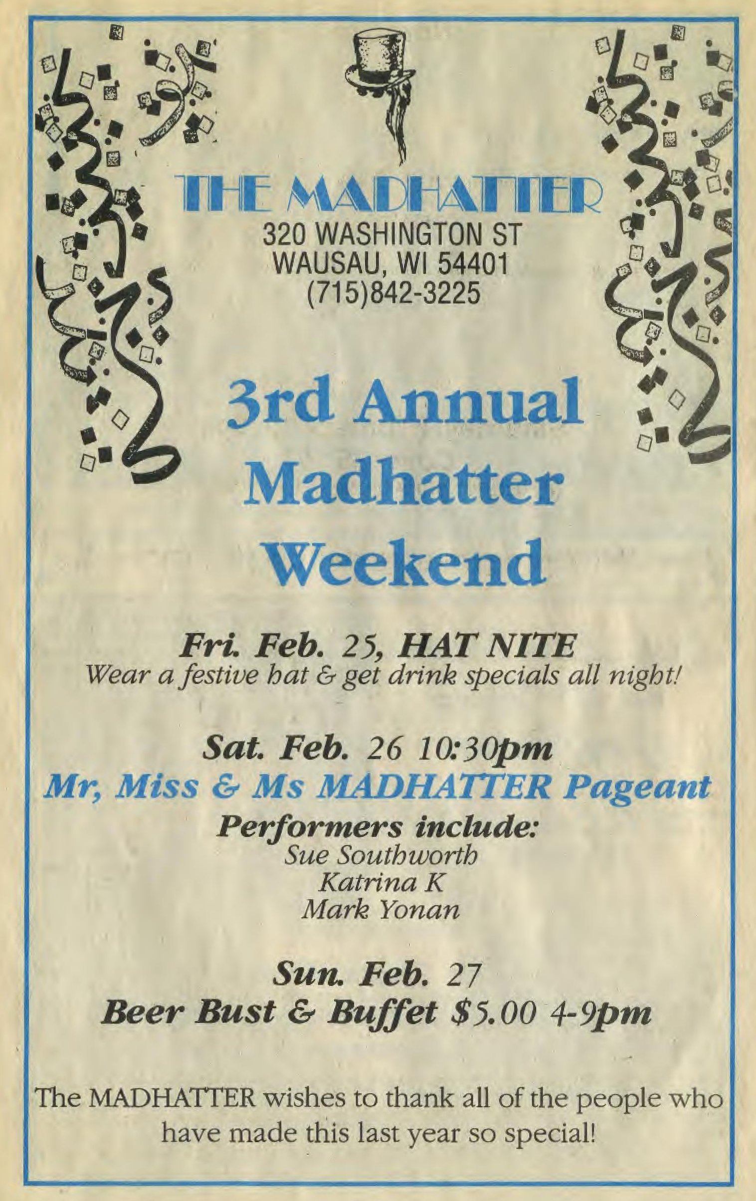 'The MadHatter' bar opened in Wausau when Ann Brunow took over the bar Masquers from David and Dan, who had previously also operated the R-Bar in Wausau. The bar was variously referred to as two words 'Mad Hatter" versus the one-word 'Madhatter', even the logo not making the distinction clear. The last mention found of the bar thus far is an advertisment for the 1997 Miss Central Gay Wisconsin USofA Pageant, hosted by 1996 winner Eileen Dover. Any additional information is available from anyone willing to contribute it. |
