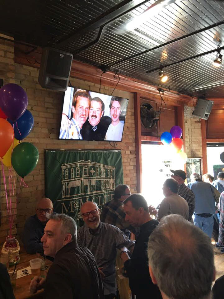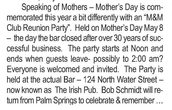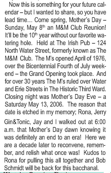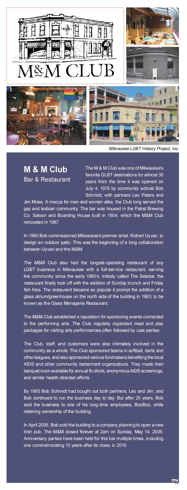 The M & M Club was one of Milwaukee's favorite GLBT destinations for almost 30 years from the time it was opened on July 4, 1976 by community activist Bob Schmidt, with partners Leo Peters and Jime Moes. A mecca for men and women looking to relax, meet friends new and old, and join in community events, the Club long served the gay and lesbian community with a mix of activities unique in the Milwaukee business scene. Housed in the Pabst Brewing Co. Saloon and Boarding House built in 1904, and renovated in 1987, the M & M Club was for thirty years a gateway business in Milwaukee's Historic Third Ward. (An early ad for the bar, appearing in the September 1976 issue of the GPU News, may explain the genesis of the name, "M&M"-- a logo reads "MAN&(Another)Man".) But a 15th anniversary booklet has another explanation: according to that, in the code of gay men communicating in the midst of heterosexual colleagues, "the letters M&M+ were used to describe a gentleman of better than average qualities or 'Medium Meat Plus'." The true genesis of the name is still closely held. The August 1976 issue of the local "GLIB Guide" describes the business as follows: "Plush, roomy. Just up from the Inferno and Wreck Room. Large dance floor. New." In 1980 Bob decided he wanted an outdoor patio. He commissioned Milwaukee's premier artist, Robert Uyvari, to design the project and work with the craftsmen start to finish. This was the beginnning of a long collaboration between Uyvari and the M&M, including several art shows and design of an exclusive M&M Christmas card. Throughout its history, the Club featured daily drink specials, ranging from happy hour 2-for-1 cocktails, to special pricing and themes on certain nights of the week. There was a regular schedule of entertainment ranging from professional piano and singer acts, to sing-along/ karoke nights. The M&M Club also had the longest-operating restaurant of any LGBT business in Milwaukee with a full-service restaurant, serving the community since the early 1980's. Beginning in fits and starts, it began to take hold with lunch soup and sandwich schedule in 1977, advertising as The Sideboard. The restaurant really took off with the addition of Sunday brunch and Friday fish frys- it quickly evolved into a fully staffed and 7-day-a-week food operation. With full menus and daily specials, including lunches, The M&M Club Restaurant became popular enough to prompt the addition of a glass attrium/ greenhouse on the north side of the building to house restaurant seating in 1983; and from that time on the restaurant was more frequently known as the Glass Menagerie Restaurant. The business also hosted meetings, banquets, and other events in an upstairs banquet and meeting room renovated for that use in 1988. The M&M Club established a reputation for sponsoring events connected to the performing arts. The Club regularly organized meal and play packages for visiting arts performances (plays, etc.), often followed by cast parties where attendees and other patrons could meet and visit with cast and staff of the performance. The Club, staff, and customers were also intimately involved in the community as a whole. The Club sponsored teams in softball, darts and other leagues, and also sponsored various fundraisers benefiting the local AIDS and other community betterment organizations. They made their banquet room available to the Visiting Nurses Association for annual flu shots, to the BESTD Clinic for anonymous AIDS screenings, and similar health-directed efforts. The banquet room was also used on occasion for art shows, etc. By 1985 Bob Schmidt had bought out both partners, Leo and Jim, and Bob continued to run the business day to day. But after 25 years, Bob was ready to relax, and in 2002 sold the business to one of his long-time employees, BooBoo, while retaining ownership of the building. But business wasn't the same without Bob Schmidt around, and, in part because of a changing neighborhood (gentrification, an increasingly difficult parking situation, etc.), the business went into decline. In April 2006 Bob Schmidt sold the building to a Chicago company, which announced plans to reopen it as an Irish pub. The news broke late in April 2006 that the bar would close at end of business on Saturday, May 13, 2006. The final "Last Call" week featured no end of "lasts"- last Sunday brunch, last show, last Thursday night 2-4-1, last Friday fish fry, and finally the last karoke and contest on that Saturday night-- all well attended by a community in shock. Shortly after midnight, the packed crowd choked out the song "For the Good Times", and the show microphones went silent for the last time. Bob Schmidt and many other long-time employees and customers left the bar for the final time, and early on Sunday morning, May 14, 2006, the M&M Club closed its doors forever. View the M & M Club's web site as it existed at the time of its closing at this link (will open in a separate browser window). Unlike many bars however, the story doesn't end there. The M&M Club was so popular and cherished by so many people that anniversary parties have been held several years since the club's closing. The latest party was on Sunday May 8, 2016, the 10th anniversary of the bar closing, in the same building (which was then an Irish pub). The party was attended by as many as 300 people, including former owner Bob Schmidt and many other long-time employees and customers. The Club was also honored with the creation of an historical panel for display at PrideFest 2016 and future Pride celebrations. A 15th anniversary reunion of the bar's closing was planned for Mother's Day, May 2021-- but the COVID-19 coronovirus pandemic forced its cancellation. Instead, an anniversary party was held on Mother's Day, May 8, 2022 instead- at 'Tied House', the current name of the business in the former M&M Club building.