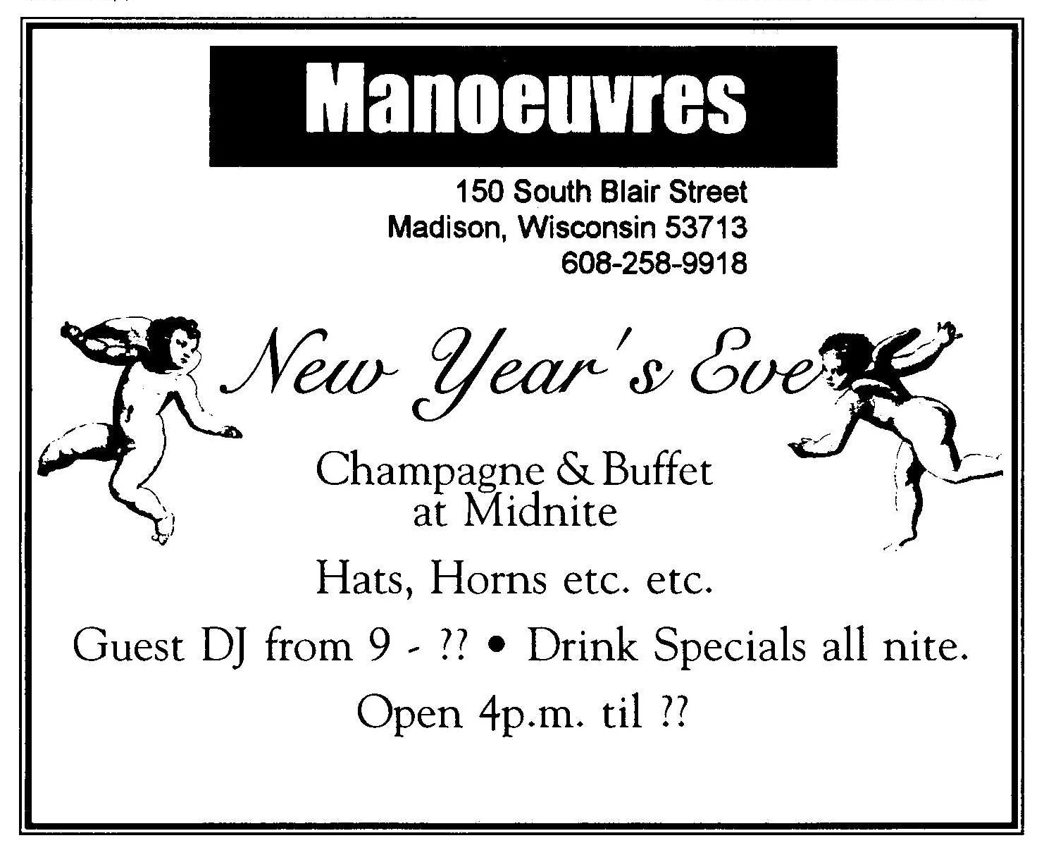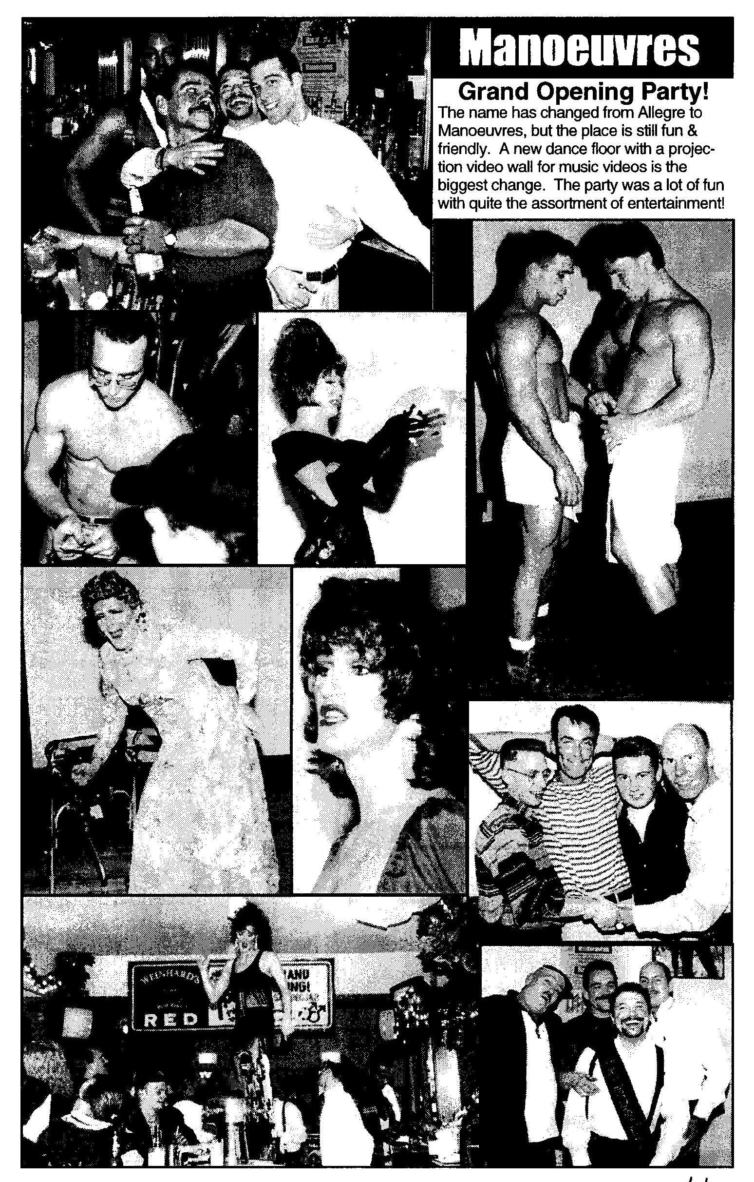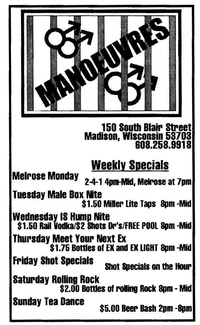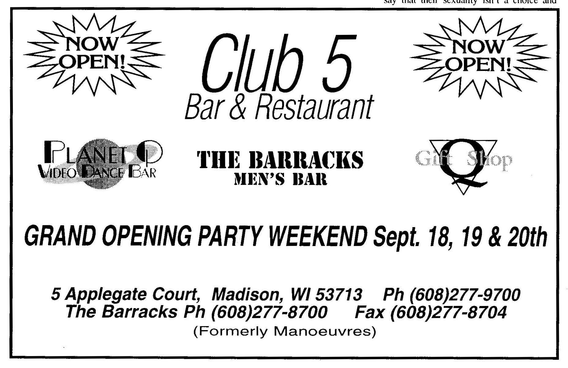 This bar was first advertised as 'Allegre' for its Grand Opening Celebration late January 1995. While there was another Allegre advertisement in 'In Step' magazine as late as June 1995, in fact the bar had already changed names. In April 1996, the Nightlife column in Quest magazine (v3-15) listed the bar as 'Manoeuvres', saying "Completely remodeled, formerly Allegre. A hot new dance video bar with 7 monitors and a 10ft projection wall." (Manoeuvres and the Mad Bar were apparently a joint business, opening together. In December 1997 they held their 3rd anniversary (ad in Quest 4-21 p9).) In December 1997 the bar held their 3rd anniversary (a bit misleading as they had only been named 'Manoeuvres' for 2+ years) (ad in Quest v4-21, pg 9). In 1998 rumors were that the owner wanted to relocate the bar to a larger and more gay-friendly site. After searching for locations and navigating through licensing hurtles, by mid-1998, the bar's owners moved ahead with big plans to close and reopen as a much expanded bar. One of the last advertisements appeared in 'Wisconsin Light' newwspaper (volume 11-issue 17, pg 12) saying "Manueuvres is still open", but also saying "coming" were Club 5, The Barracks, and other features at a new location soon. The change was official by August. An advertisement in IN Step newspaper (vol 15-17) headed "So long, goodbye..." advised of a Final Show on August 23, 1998, and a closing date of Sunday, August 30. But the ad continues: "Then the Fun Begins" with a complex holding the Club 5 Bar & Restaurant, The Barracks men's bar, Planet Q Video Dance Bar, and Q Gift Shop all to open September 3, 1998. Advertisements immediately after (such as one in Quest magazine, v5-16) touted the new bar "Club 5" and an attached leather bar 'The Barracks'; and at the bottom of the ad the words 'Formerly Manoeuvres'. |