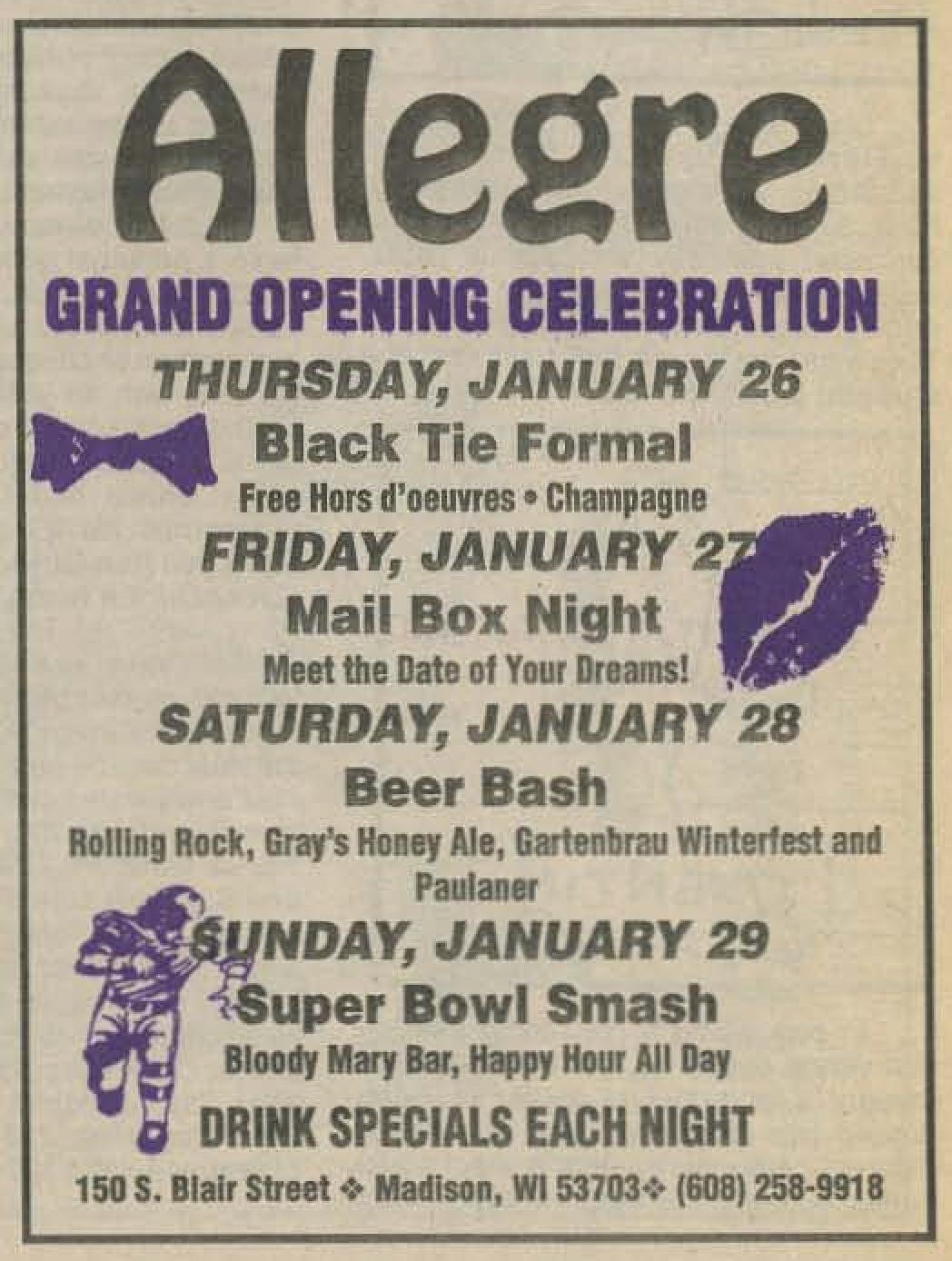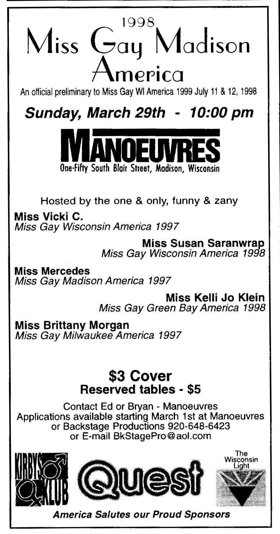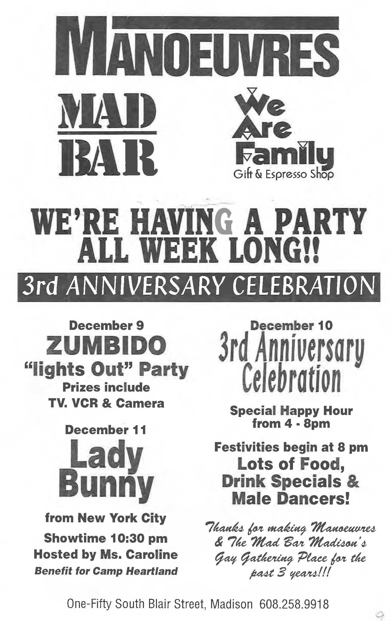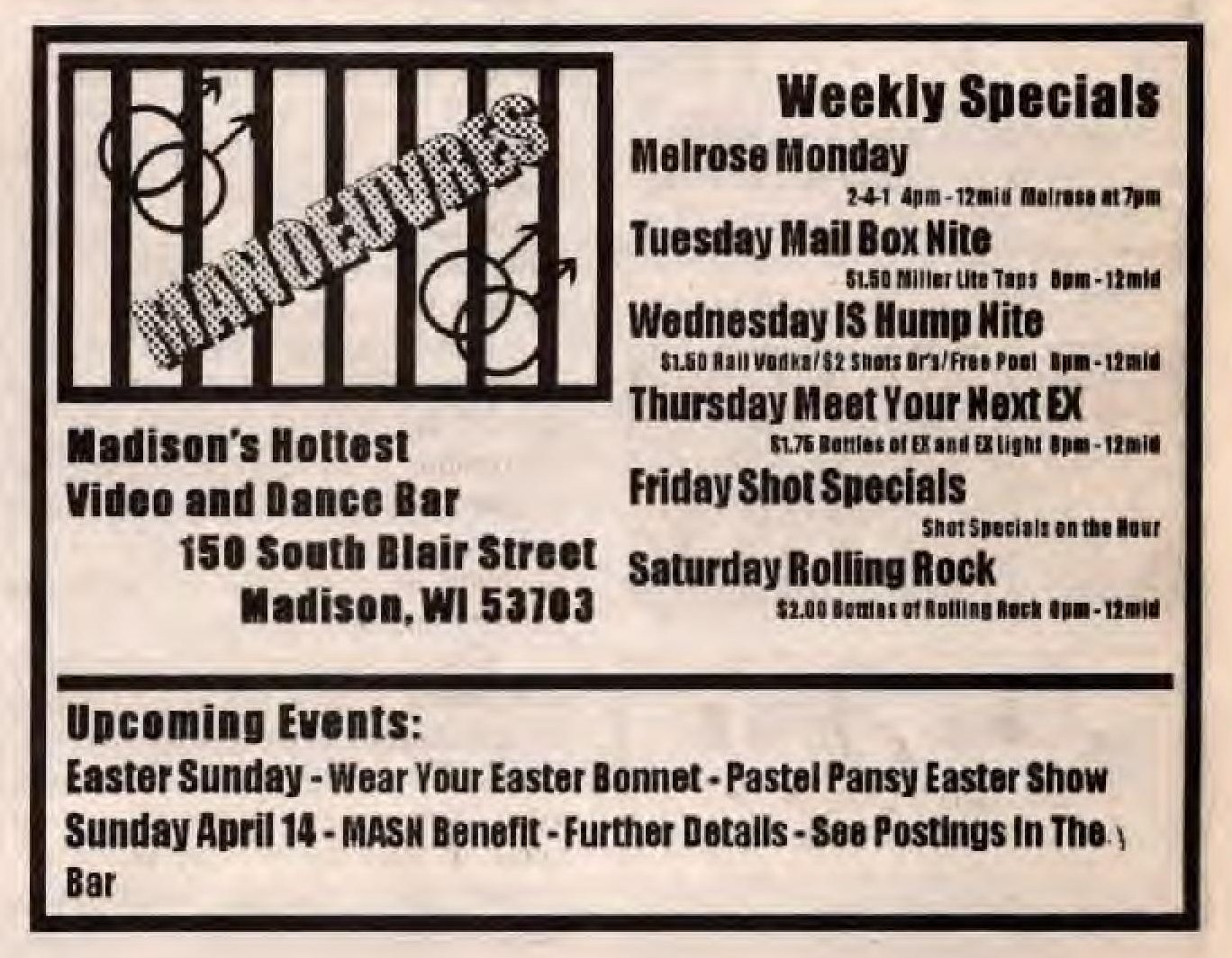 This bar was first advertised as 'Allegre' for its Grand Opening Celebration late January 1995. While there was another Allegre advertisement in 'In Step' magazine as late as June 1995, in fact the bar had already changed names. In April 1996, the Nightlife column in Quest magazine (v3-15) listed the bar as 'Manoeuvres', saying "Completely remodeled, formerly Allegre. A hot new dance video bar with 7 monitors and a 10ft projection wall." (Manoeuvres and the Mad Bar were apparently a joint business, opening together. In December 1997 they held their 3rd anniversary (ad in Quest 4-21 p9).) In December 1997 the bar held their 3rd anniversary (a bit misleading as they had only been named 'Manoeuvres' for 2+ years) (ad in Quest v4-21, pg 9). In 1998 rumors were that the owner wanted to relocate the bar to a larger and more gay-friendly site. After searching for locations and navigating through licensing hurtles, by mid-1998, the bar's owners moved ahead with big plans to close and reopen as a much expanded bar. One of the last advertisements appeared in 'Wisconsin Light' newwspaper (volume 11-issue 17, pg 12) saying "Manueuvres is still open", but also saying "coming" were Club 5, The Barracks, and other features at a new location soon. The change was official by August. An advertisement in IN Step newspaper (vol 15-17) headed "So long, goodbye..." advised of a Final Show on August 23, 1998, and a closing date of Sunday, August 30. But the ad continues: "Then the Fun Begins" with a complex holding the Club 5 Bar & Restaurant, The Barracks men's bar, Planet Q Video Dance Bar, and Q Gift Shop all to open September 3, 1998. Advertisements immediately after (such as one in Quest magazine, v5-16) touted the new bar "Club 5" and an attached leather bar 'The Barracks'; and at the bottom of the ad the words 'Formerly Manoeuvres'. |