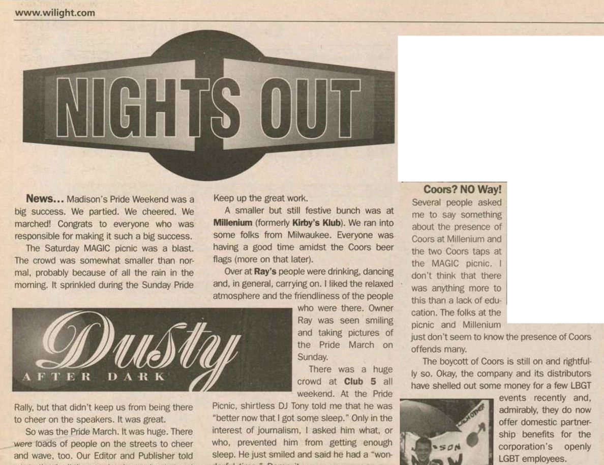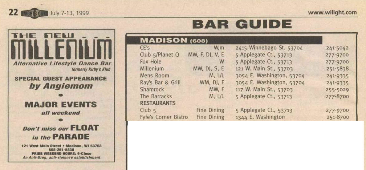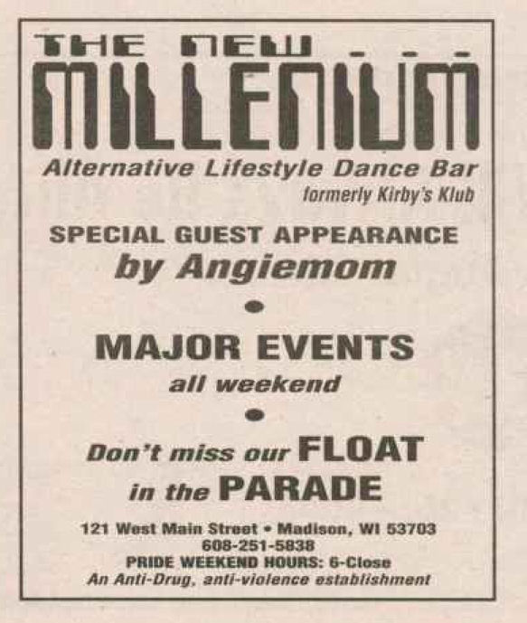 Millenium may hold the record as shortest time open of any LGBT bar in the state. It was apparently opened sometime in July 1999. The location had already held three LGBT bars in less than 2 years: first "R Place" (May-December 1996), then "Scandals" (March-October 1997), and then "Kirby's Klub" (October 1997-June 1999). By August 1999, it had closed and reopened again as yet another bar, named Rainbow Room. Millenium was thus the fourth in a long line of names for an LGBT bar in this location (121 W. Main Street, Madison) over a period of just 4 years: