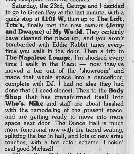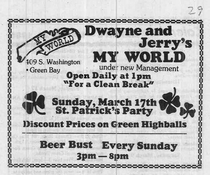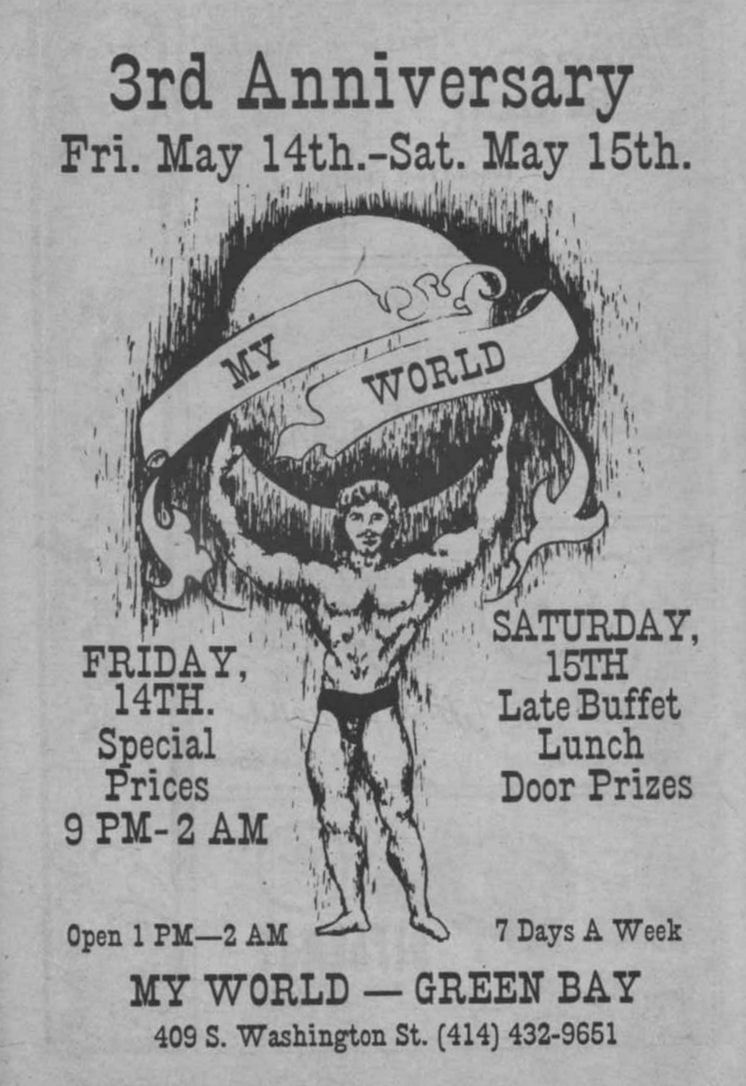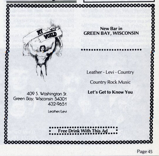 My World bar in Green Bay was opened by Bob Hackl and Scott. It advertised itself as "Leather Levi Country/ Country Rock Music" bar. It enjoyed great success, and celebrated its 5th anniversary in April-May 1984. For a time, My World also was home to another bar, the Silver Saddle. It advertised in 1982-1983 as a lesbian bar, entered via the rear entrance of My World. The bar changed ownership in February 1985. It was shown in the same issue of In Step as being owned by "Jerry and Dwight" and advertised as being owned by "Dwayne and Jerry". Shortly after, the bar was renamed "Brandy's". More information about this business is welcomed from anyone who can contribute it. |