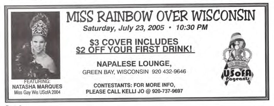 Ad: Miss Rainbow Over Wisconsin Pageant featuring Natasha Marques, Miss Gay Wis USofA 2004