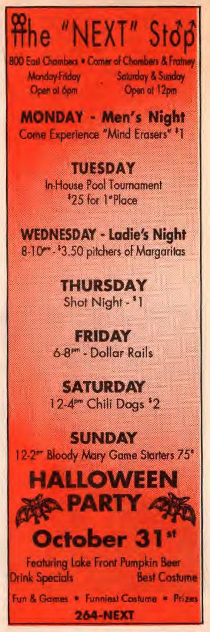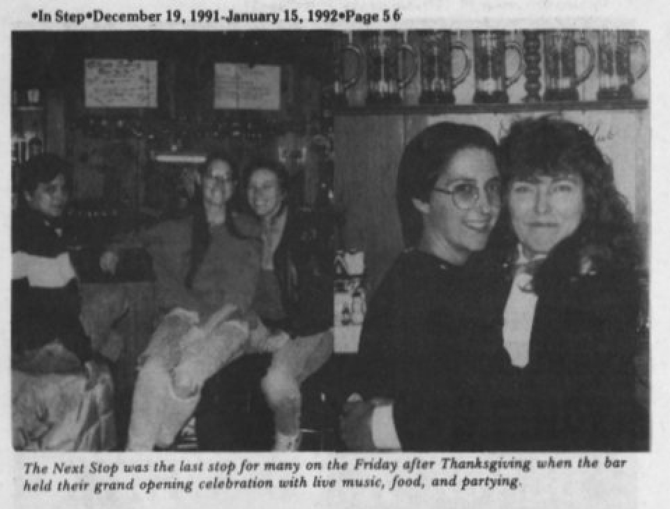 Very little is known about 'the NEXT Stop' bar in Milwaukee. We have thus far found only a single advertisement in a 1991 issue of 'In Step' magazine advertising their upcoming Halloween party, along with a single photo from their Grand Opening celebration the Friday after Thanksgiving 1991. However based on its logo, this was obviously primarily a lesbian bar.