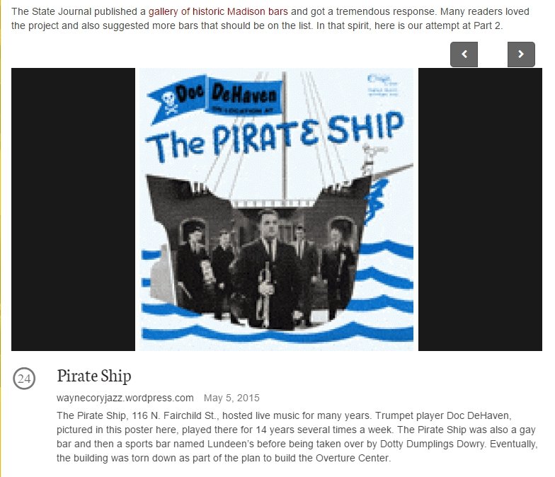 The Pirate Ship was a bar in Madison. It is mentioned briefly in the "GLIB Guide" issue 2 of August 1976 as "The Pirate Ship is a large bar downtown with a rustic sort of decor."