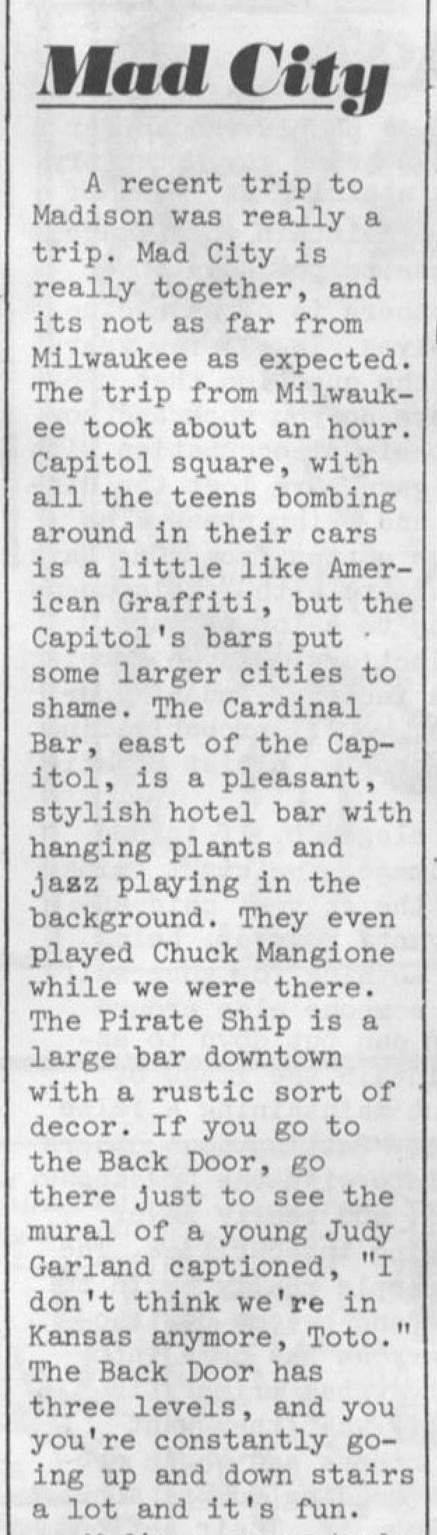 I was in Madison from ~’72-’76 so it must have been during those years that I was a regular at the Pirate Ship. There were a couple other gay bars catering to students and a younger clientele, but my thing was older men.