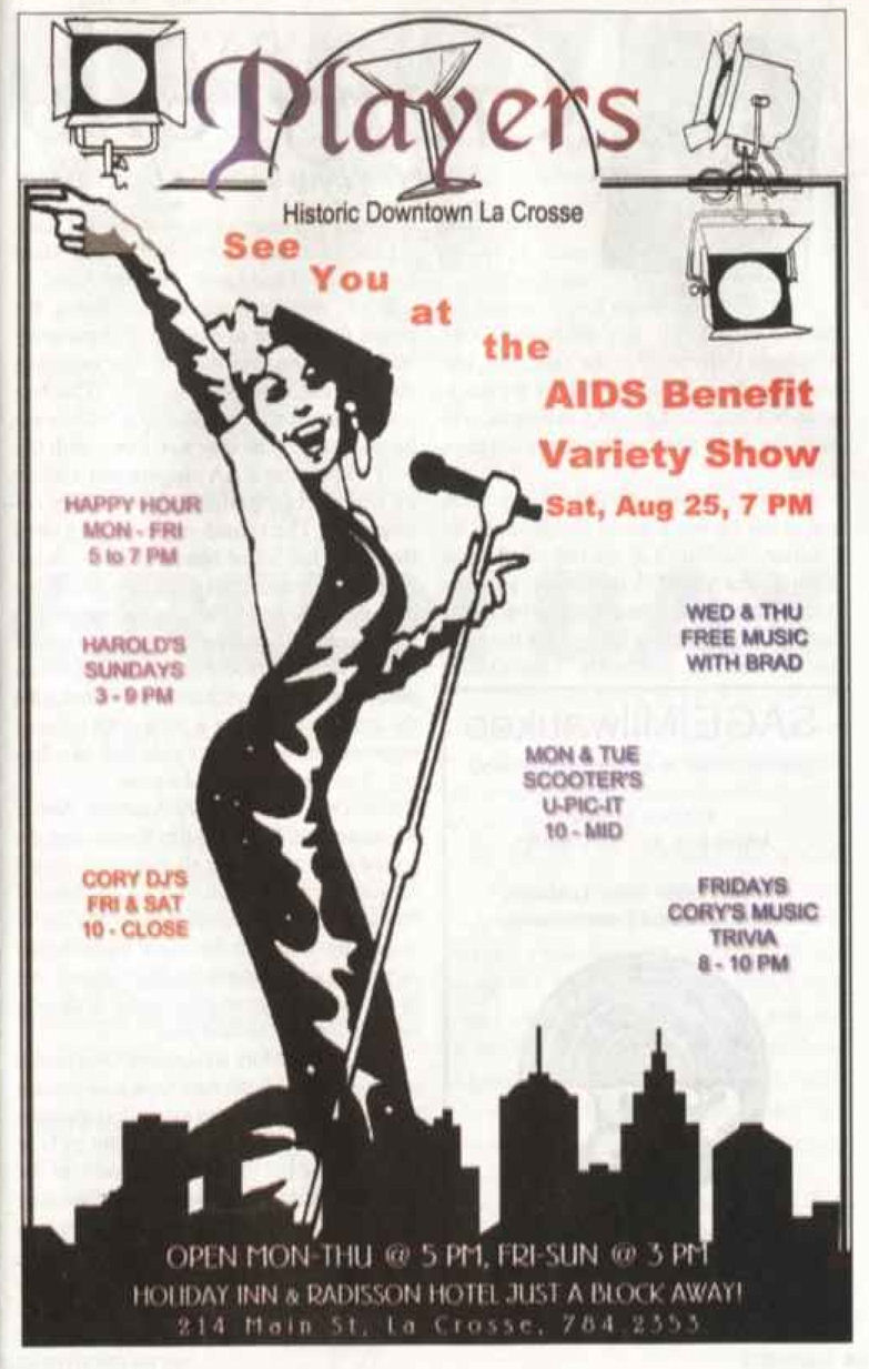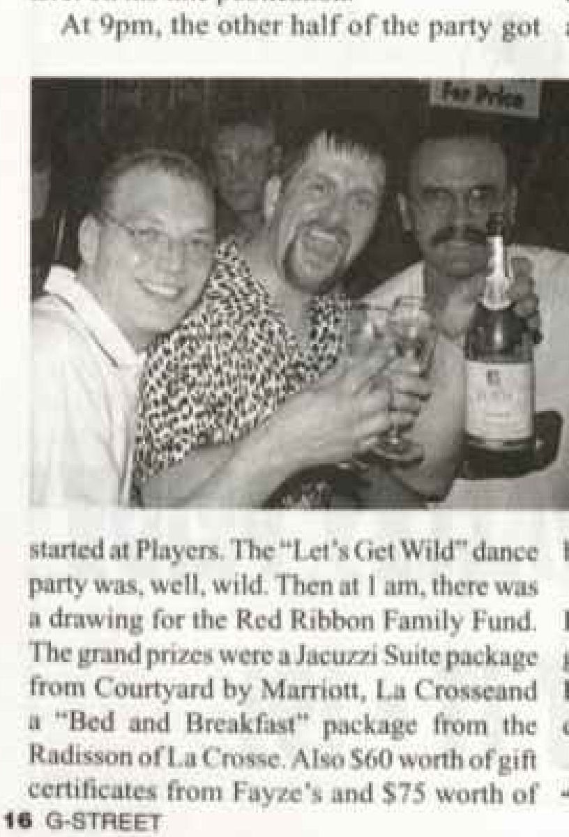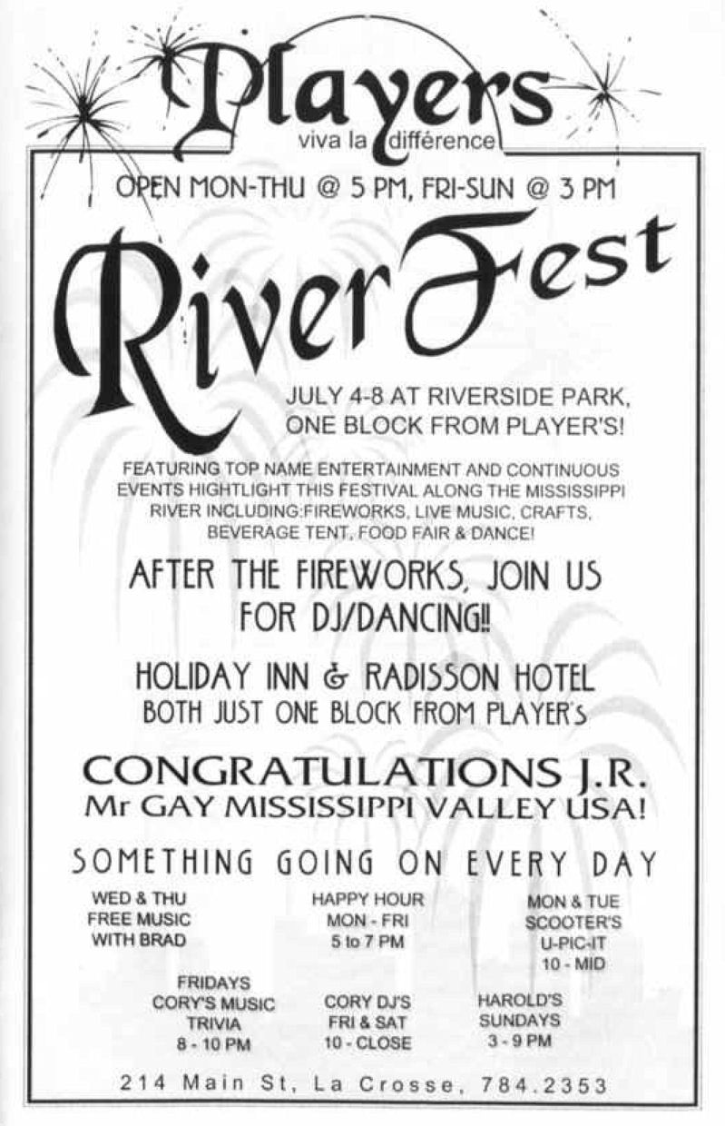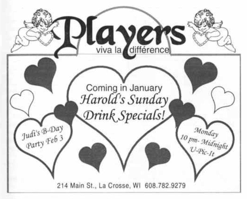The La Crosse bar 'Players' was popular in the area for some 20 years- but is relatively little known to people outside the La Crosse area in the state of Wisconsin. Players held many parties, drag and AIDS benefit shows, 'Mr/Miss Gay Mississippi Valley' pageants, and was active in 'Pride Along the Mississippi' celebrations, working cooperatively with other local bars at the time such as Rainbow's End and My Place. They appear to have done most of their advertising in the short-lived 'G-Street magazine' (2001-2002). But because the bar doesn't seem to have advertised much (or at all) in state-wide LGBT periodicals such as 'Quest magazine', people outside the area were largely in the dark about its activities and reputation in the area. Victor M. Marcias-Gonzalez, Professor of History at UW-La Crosse, reports the following locations and owners: 214 Main Street: