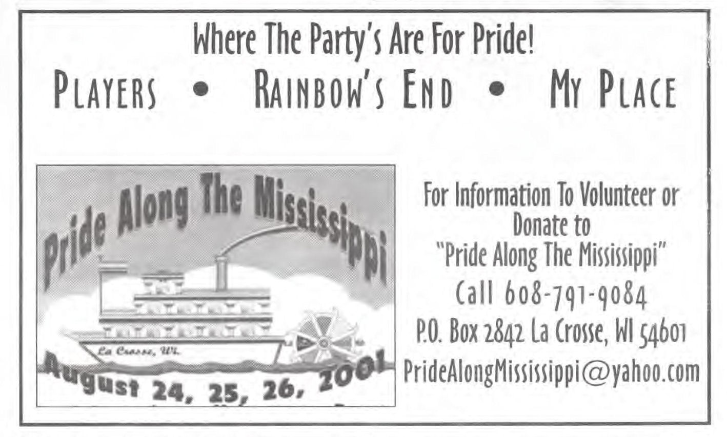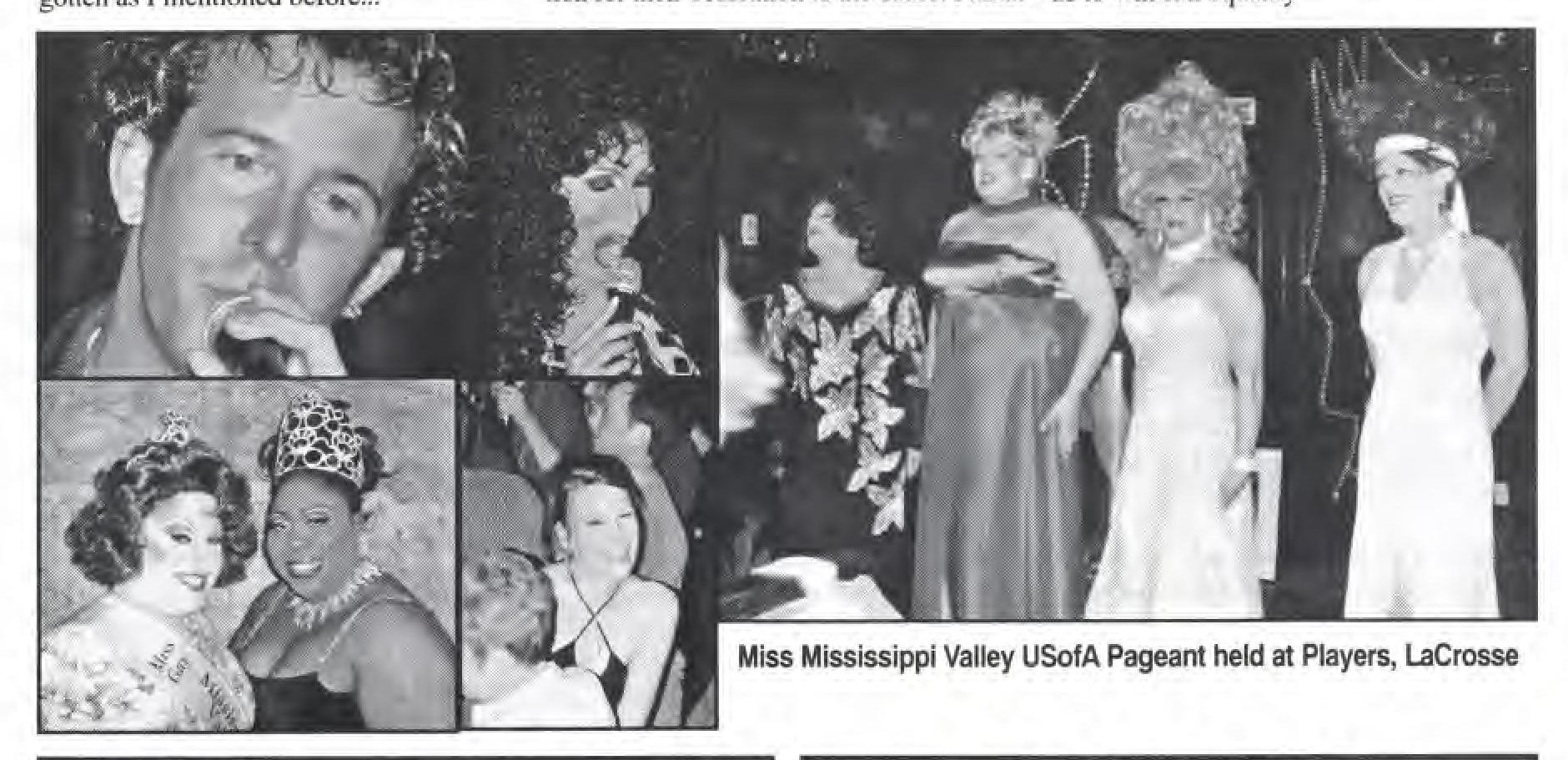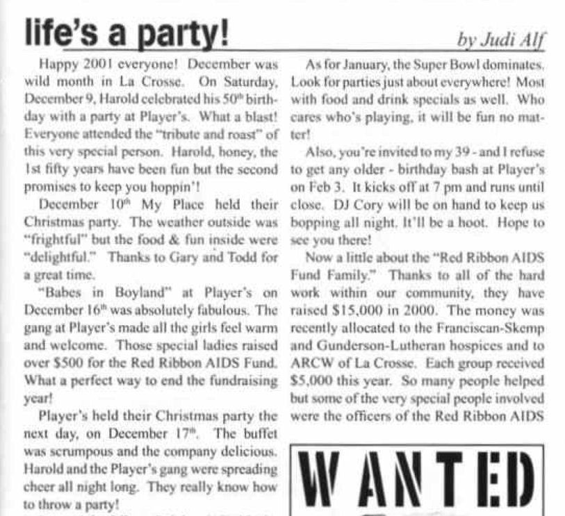 The La Crosse bar 'Players' was popular in the area for some 20 years- but is relatively little known to people outside the La Crosse area in the state of Wisconsin. Players held many parties, drag and AIDS benefit shows, 'Mr/Miss Gay Mississippi Valley' pageants, and was active in 'Pride Along the Mississippi' celebrations, working cooperatively with other local bars at the time such as Rainbow's End and My Place. They appear to have done most of their advertising in the short-lived 'G-Street magazine' (2001-2002). But because the bar doesn't seem to have advertised much (or at all) in state-wide LGBT periodicals such as 'Quest magazine', people outside the area were largely in the dark about its activities and reputation in the area. Victor M. Marcias-Gonzalez, Professor of History at UW-La Crosse, reports the following locations and owners: 214 Main Street: