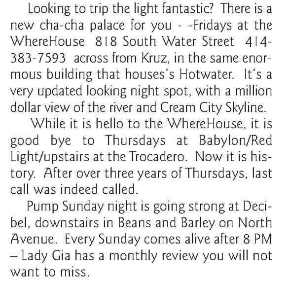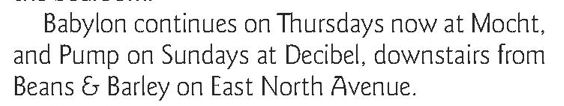 Article: 'Pump Sunday night is going strong at Decibel' (basement of Beans & Barley on East side) 1901 E. North Ave.