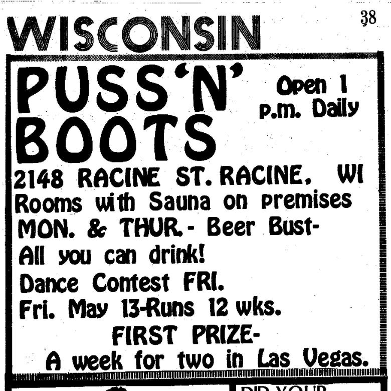 Puss 'n' Boots is largely a mystery. The single reference we have to it are two advertisements and a listing for it in the single issue of a short-lived magazine called 'Milwaukee Gay Guide' issued in May 1977 (labeled "Summer 1977"). One ad offers a "Free Drink" (buy one get one free), while the other ad mentions beer busts and Friday dance contest, and also says "Rooms with sauna on premises"-- which would lead one to believe it might also have been a so-called gay 'bathhouse' (i.e. place for anonymous gay sex). We have thus far found no further reference to the bar. However, the long-established lesbian and gay bar Jo'Dee's International was right across the street. We are unsure whether this was competition or had some relationship with Jo'Dee's. (The location for 'Puss 'n' Boots' was briefly resurrected as a gay bar and disco in 1982, called Stealers; but that 1982 resurrection appears to have been open only a couple of months.) More information about Puss 'n' Boots bar is welcomed from anyone who can contribute it.