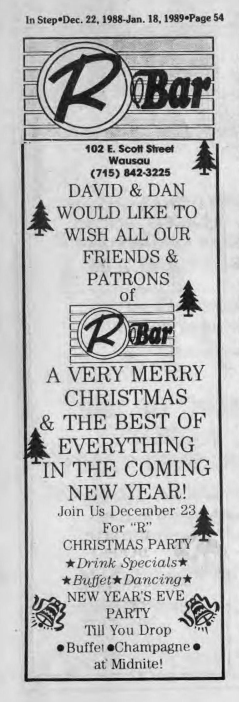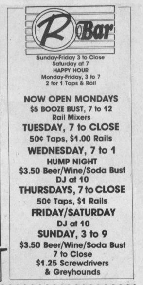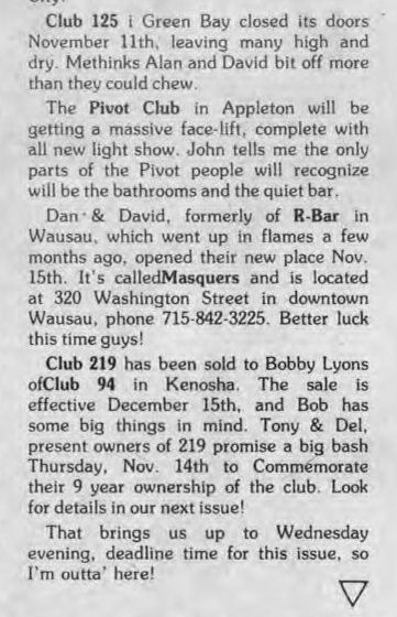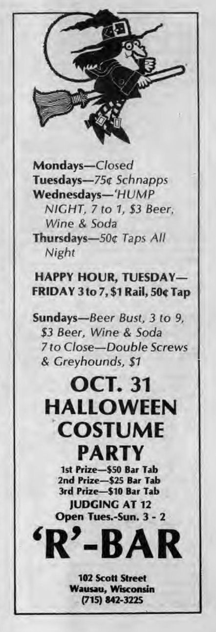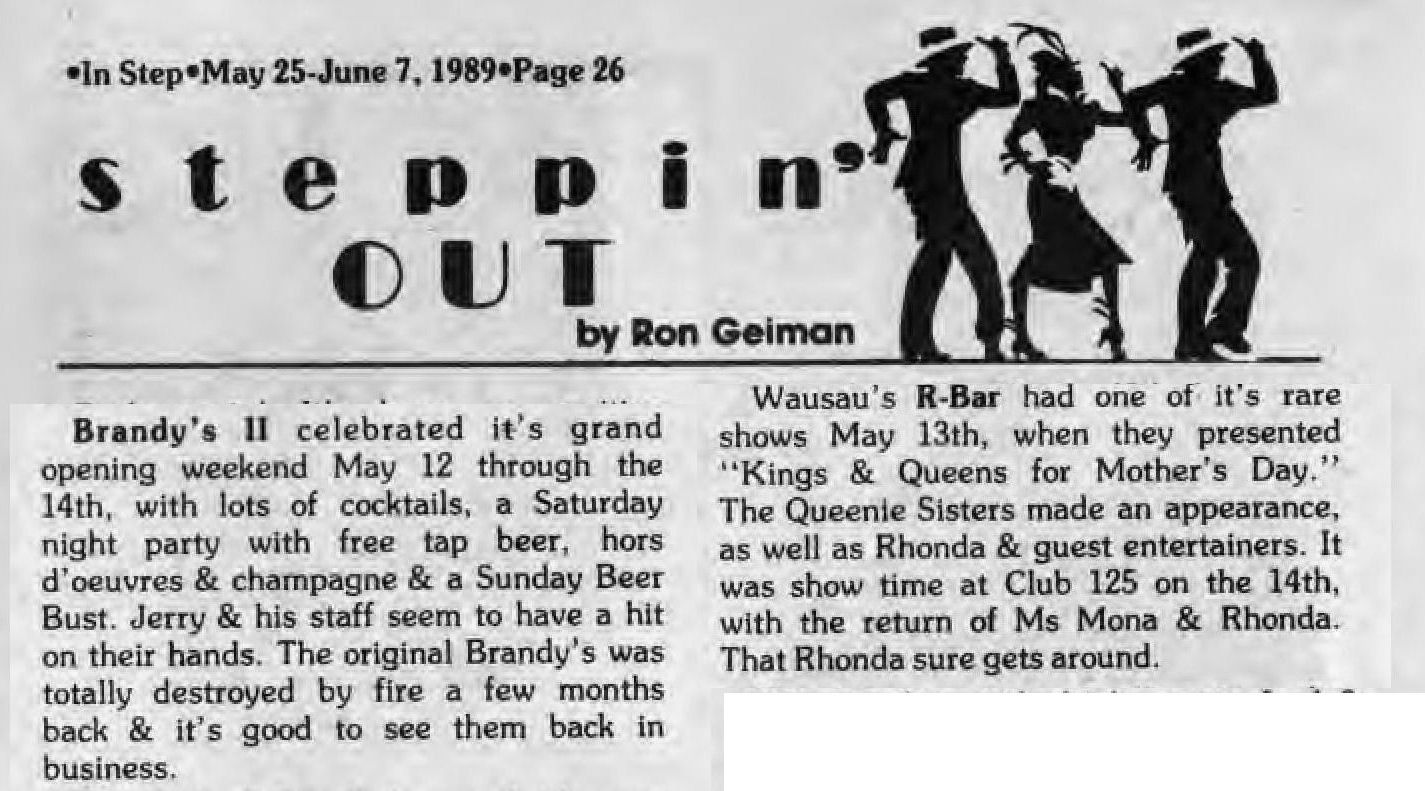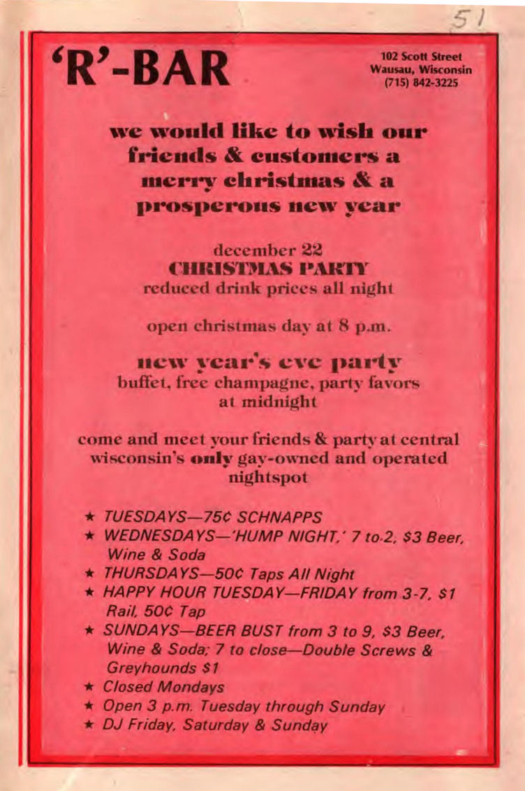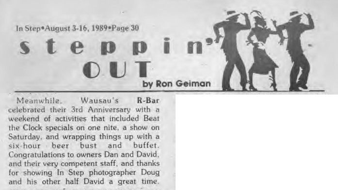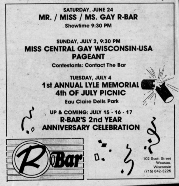 R-Bar opened early July of 1986 by 'David and Dan' in the ground floor of a 3-story building in Wausau. They advertised as "Central Wisconsin's ONLY gay-owned and operated nightspot". In January 1989 a popular bartender there, Lyle Duranceau, passed away; see tribute to him written and printed in Wisconsin Light. The bar celebrated their third anniversary in July 1989, but weeks later, early the morning of August 16, the bar was destroyed in a fire originating in the floor above the bar. A roof collapse condemned the entire building. The owners Dave and Dan went on to open another bar, Masquers, in December 1989. More information about this business is welcomed from anyone who can contribute it. |