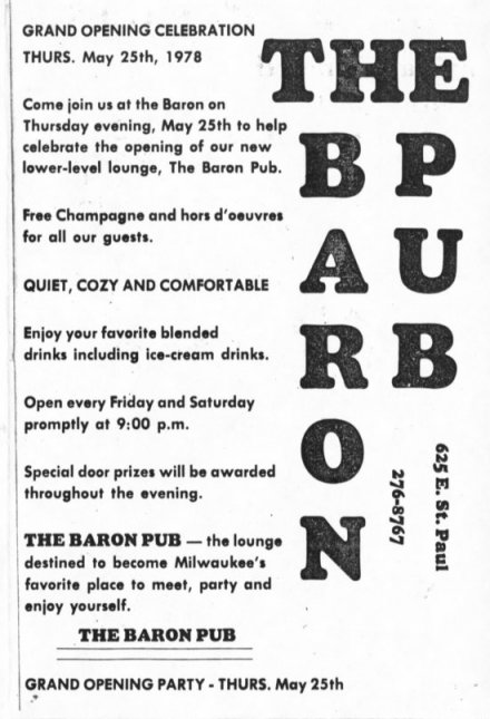When The Red Baron (also known simply as "The Baron") opened in June 1977, it was proclaimed one of the "very best discos found anywhere," with three bars on the main floor, a central dance floor, a dancing stage, disco lighting and "wall to wall carpeting." The lower level had a pool table, pinball and popcorn. (For information on the building's former life, click here.) Early Discrimination Complaints Immediately after opening (in July 1977), discrimination charges were filed against the Red Baron by local women and black men. City Hall had already received over 50 complaints about the disco requiring multiple forms of ID and demanding customers buy membership cards. Alyn Hess of Gay People's Union represented six black gay men who were denied admission because it "wasn't that kind of night." The charges raised questions about Red Baron's licensing. "Nobody is sure who really owns the Red Baron," said Alderman Kevin O'Connor, as the liquor license is still in use from former tenant Mother's. The discrimination charges delayed liquor license reissuing and temporarily closed the month-old bar. Oddly, the Common Council reversed its own decision and renewed the license on July 19, 1977. Red Baron attorneys dismissed the discrimination charges as a "coordinated campaign launched by competitors like The Factory." Newspapers suspiciously commented that "the Red Baron has been advertising aggressively in the gay trades." The Red Baron reopened, although the push for paid memberships quietly ended. Peak Disco Bar The Red Baron was peak disco. The Red Baron hosted several popular performers at the time. Most notable was a performance by legendary disco diva Grace Jones on March 4, 1978 in what was probably the Red Baron's finest hour. (Jones had been scheduled to perform on two nights, but never arrived on the first scheduled night, March 3. When she did appear on the second night-- almost an hour late-- she was in a foul mood according to witness Don Schwamb, who was one of her greeters in the office. Her performance was exciting and high energy even if slightly below par.) A one-minute radio ad for the Grace Jones appearance was narrated by a deep male voice intermingled with song clips: "Grace Jones.. Is she related to a cat-- or a cobra? Grace Jones-- in Milwaukee at The Baron; where Saint Paul Avenue ends, and disco theatre begins. Grace Jones- decadent dynamo of the disco scene. Grace Jones- Friday March 3rd at 11, Saturday March 4th at midnight... At the Baron... Grace Jones.. soars above the whole galaxy of contemporary starlets." (Then female voice:) "Don't miss Grace Jones, the Queen of Disco, Friday and Saturday nights at The Baron, 625 East Saint Paul. Tickets at all Ticketron outlets and at The Baron." In an interview with the Milwaukee Journal newspaper in the 1990s (recounted in a 2016 article "A Brief History of Milwaukee's Discos" in the Shepherd Express), Red Baron manager Jeffrery Dobbs made an observation: Baron manager Jeffery Dobbs said that the new age of disco emerged from gay culture and-- although his club had a good mix of gay and straight dancers-- it was the gay community that "did disco" the best. "I can usually breeze through the dance floor and immediately know who's gay because the straight kids dance like turkeys," Dobbs told the Journal. "The gay kids are better dancers, are better mannered, and are more hip to clothes." In May 1978, the lower level was reinvented and reopened as The Baron Pub, with free champagne, ice cream drinks and "quiet, cozy and comfortable conversation." By April 1980, the Red Baron was past its prime. The bar was taken over by L&M Productions, a collective of young black men, seeking to create the best discos in the city. They also owned Rapport disco, later the Cabaret (130 E. Juneau.) Red Baron was formally renamed "The Baron" and immediately became far less "gay." The Baron didn't last long. It closed January 31, 1981 and its entire contents were sold at auction on February 11, 1981. "This sale is a must if you are in the discotheque business!" screamed the ads. Bobby Bell, owner/operator of the Red Baron, moved on to open Papagaio (515 N. Broadway) in December 1981. He was a locally famous fashion designer at T.A. Chapmans, brother of the creator/producer of "The Young & The Restless," manager of John Hawks Pub and quite a local nightlife personality. By 2021, the Red Baron disco building housed a physical therapy clinic. If the walls of that 60-year-old building could talk!